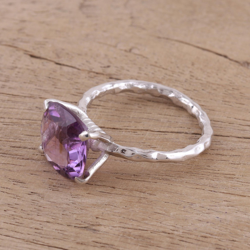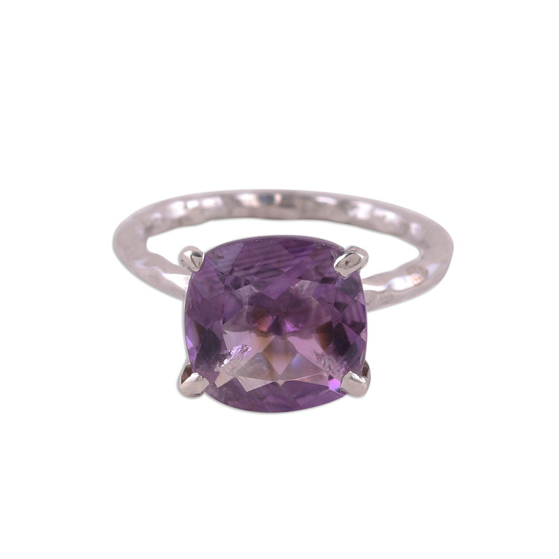 Backed by our Happiness GuaranteeHandcrafted of sterling silver with a shimmering rhodium plating, this glamorous ring is designed by Indian artisan Sehal Agarwal. She chooses a sparkling, six-carat stone of purple amethyst to crown the elegant single-stone ring.