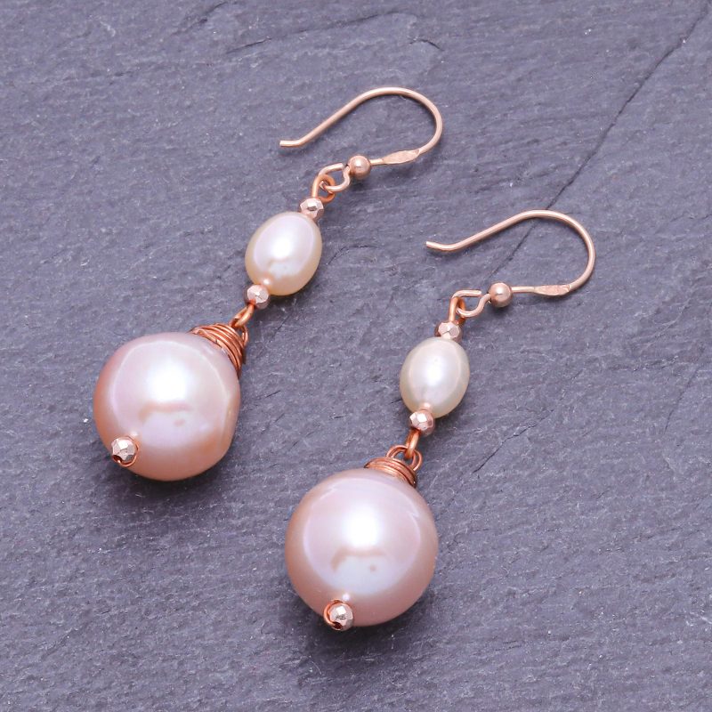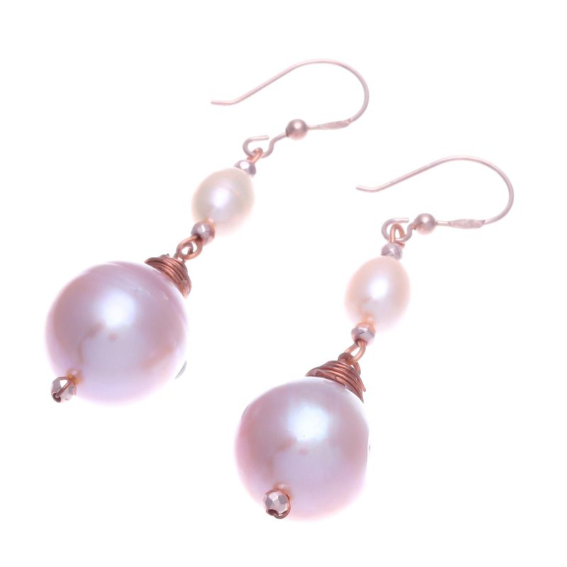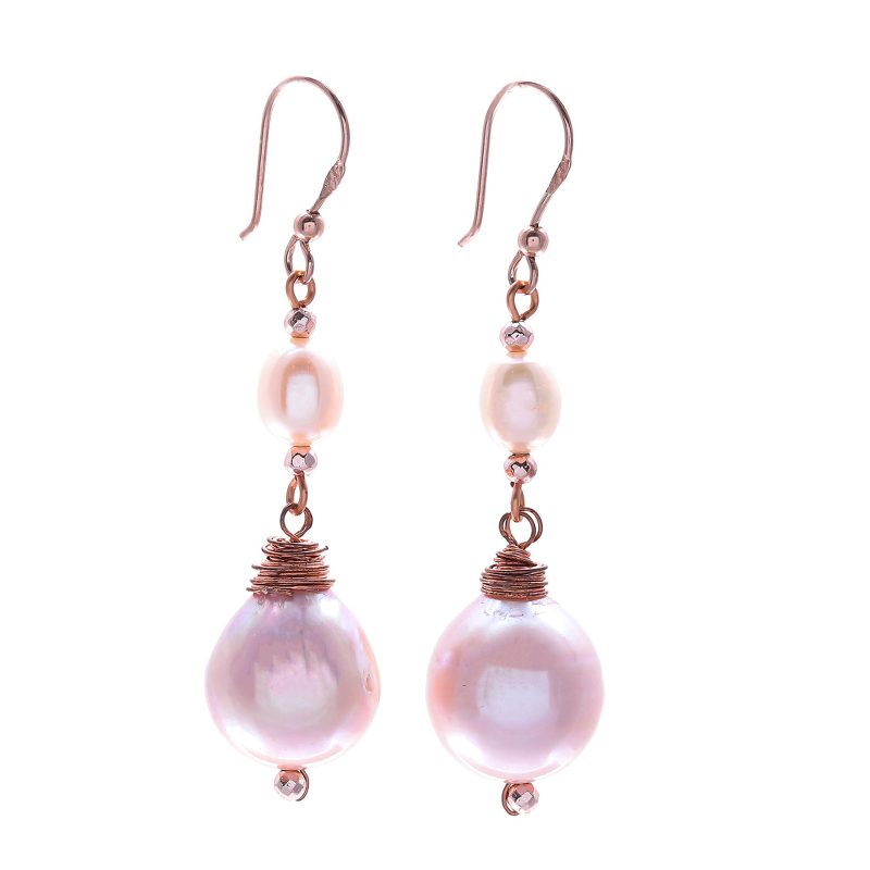 Warm rose gold glows alongside iridescent pearls on Somluck Komolmith's sublime earrings. The Thai artisan uses cultured freshwater pearls to create the earrings, adding petite 18k rose gold-plated brass beads to accents the pearls. Copper wire coils between the pearls, while 18k rose gold-plated 925 sterling silver hooks finish the pair.