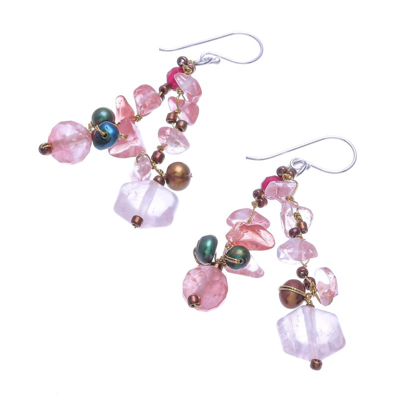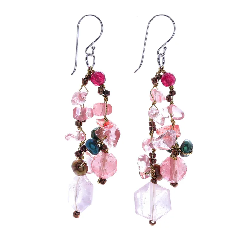Fun is never far off when you slip into Nareerat's colorful dangle earrings. The Thai artisan hand knots shimmering metallic thread around chips of dyed pink quartz, while rose quartz gems and faceted quartz add dimension. Cultured freshwater pearls dyed green and brown add a luminescent glow, and sterling silver hooks finish the pair with a bit of shine.
