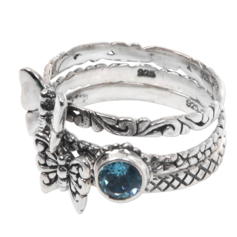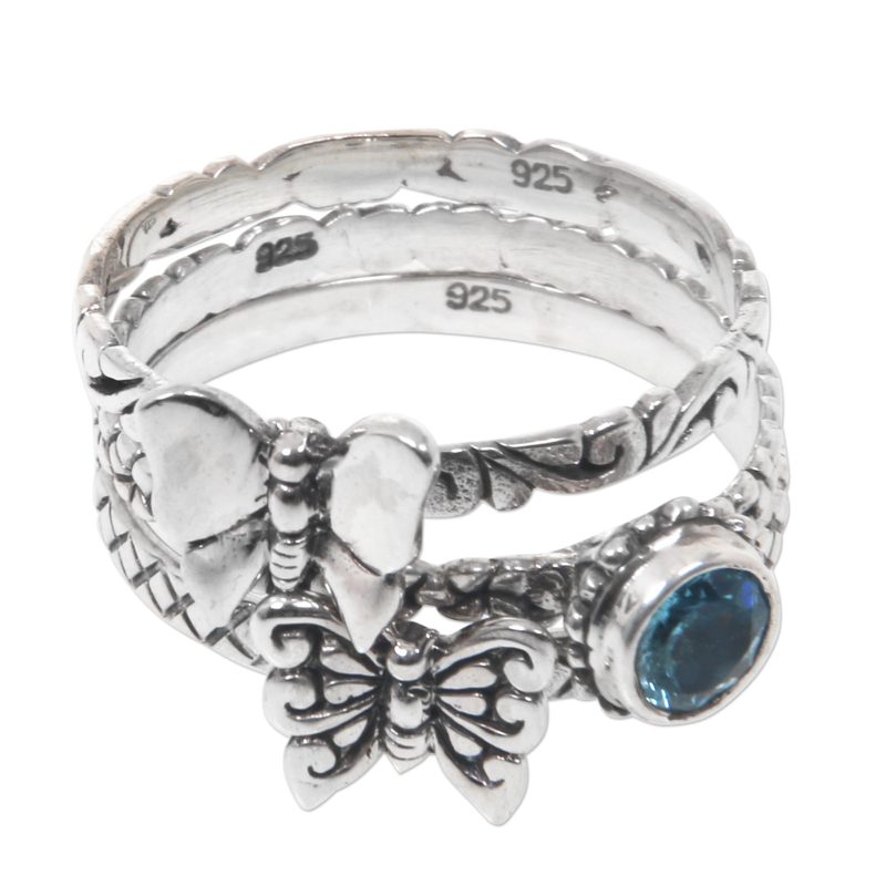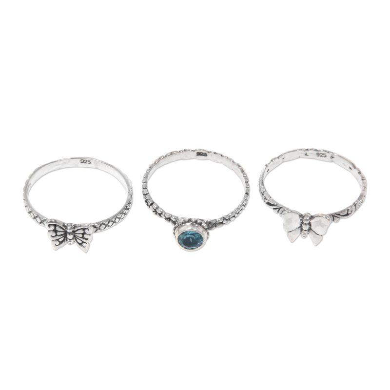This irresistible trio of sterling silver rings is presented by Balinese artisan Kadek Hendra. Each ring is unique: one features a cross-hatched band crowned by a detailed butterfly, the second features a cobblestone-textured band with a solitaire of blue topaz, and the third ring boasts a sleek polished butterfly atop a swirled band. The rings can be worn together or separately as desired.