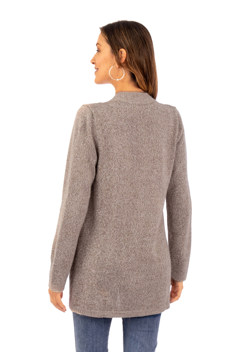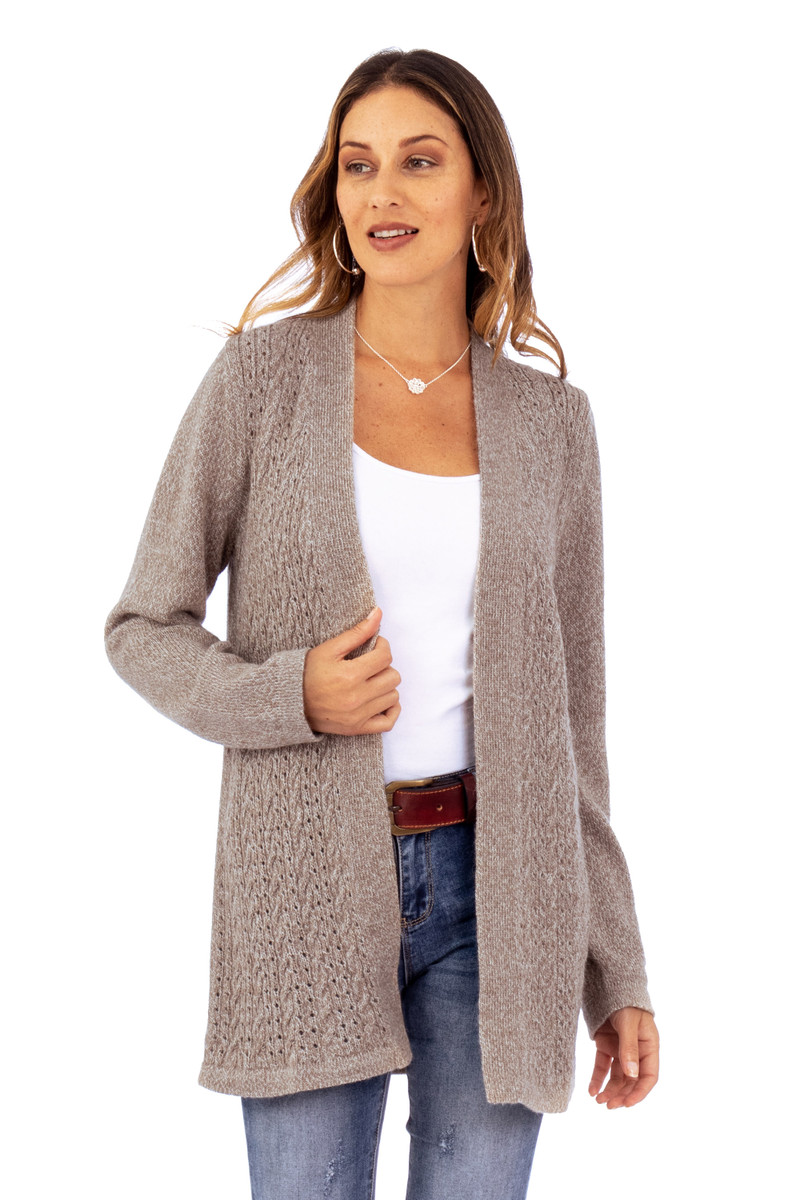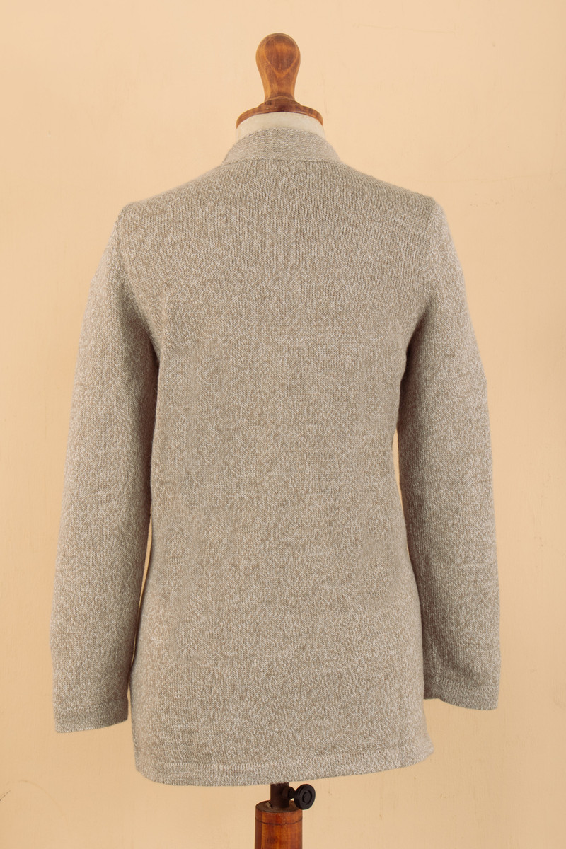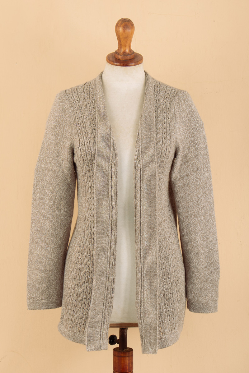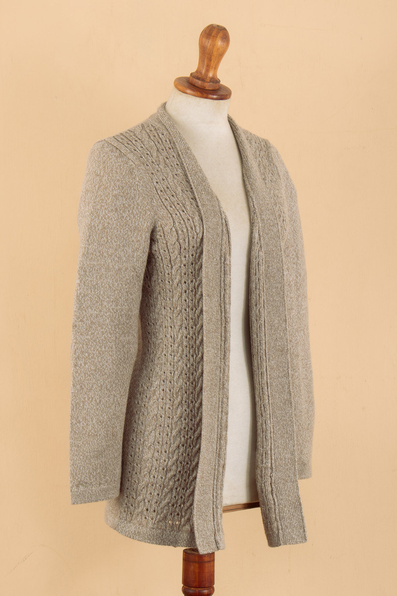 Knit accents add a sophisticated touch to Peruvian artisan Pia Zavala's newest design, inspired by the region's classic elegance. Crafted from alpaca, acrylic and wool yarns for a soft sensation, this cardigan features a refined shawl collar that finishes in long lapels, gracefully complementing the open-front style. In addition, this long-sleeve sweater comes in a beige hue, perfect to complement several ensembles.