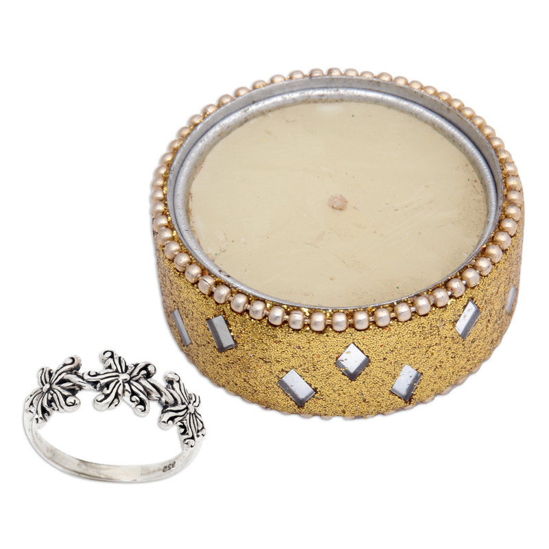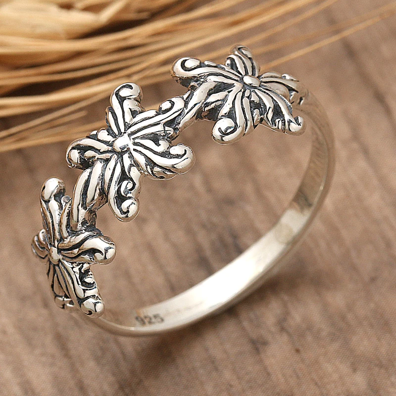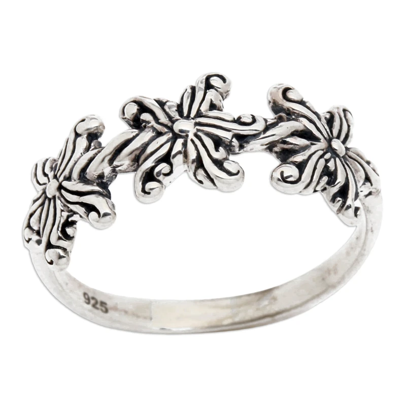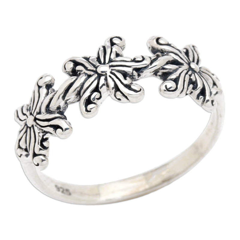 The beauty of the universe's stars descends into the Balinese lands to infuse their flowers with magical grace. Artisan Komang Wijayana presents this wondrous creation crafted by master artisans and inspired by the region's stunning flora. The band ring, made from sterling silver, boasts a combination of polished and oxidized finishes.