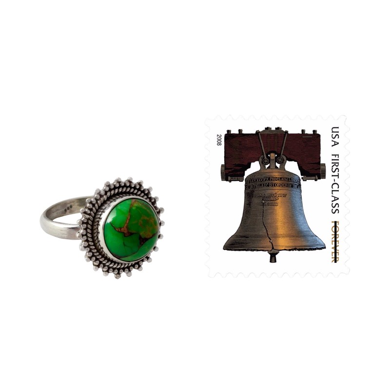 A verdant gemstone glows with fertile promise while sterling granules surround it in a halo. Working in silver, Aparna crafts an exquisite ring with composite turquoise.