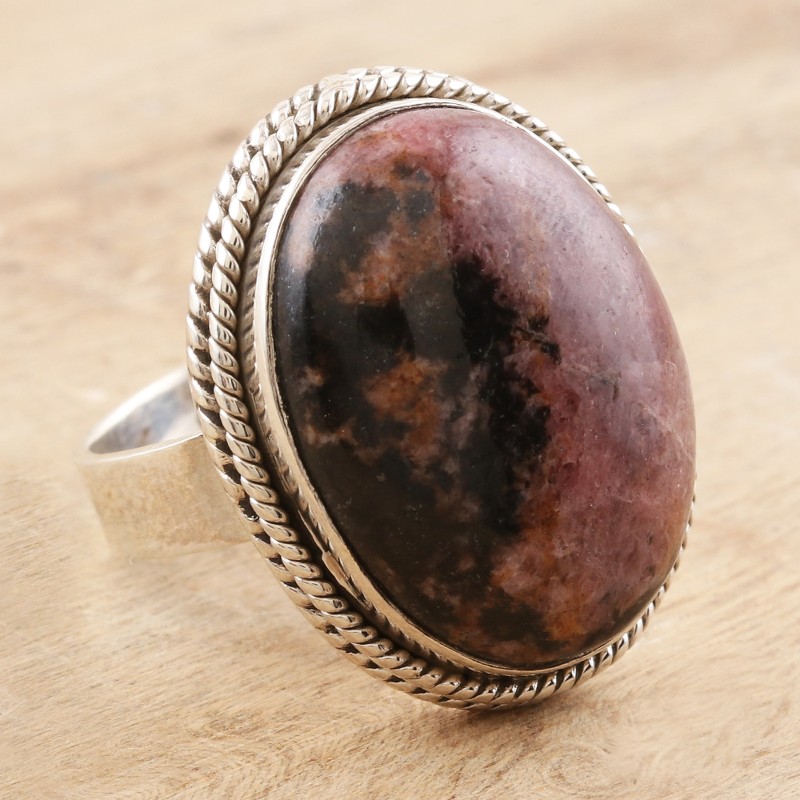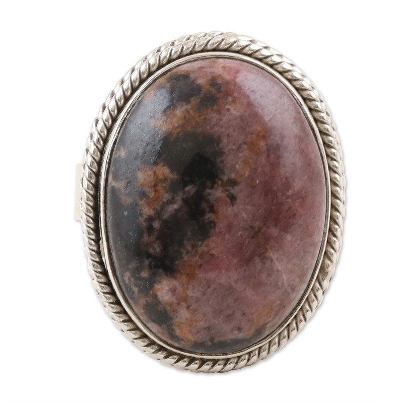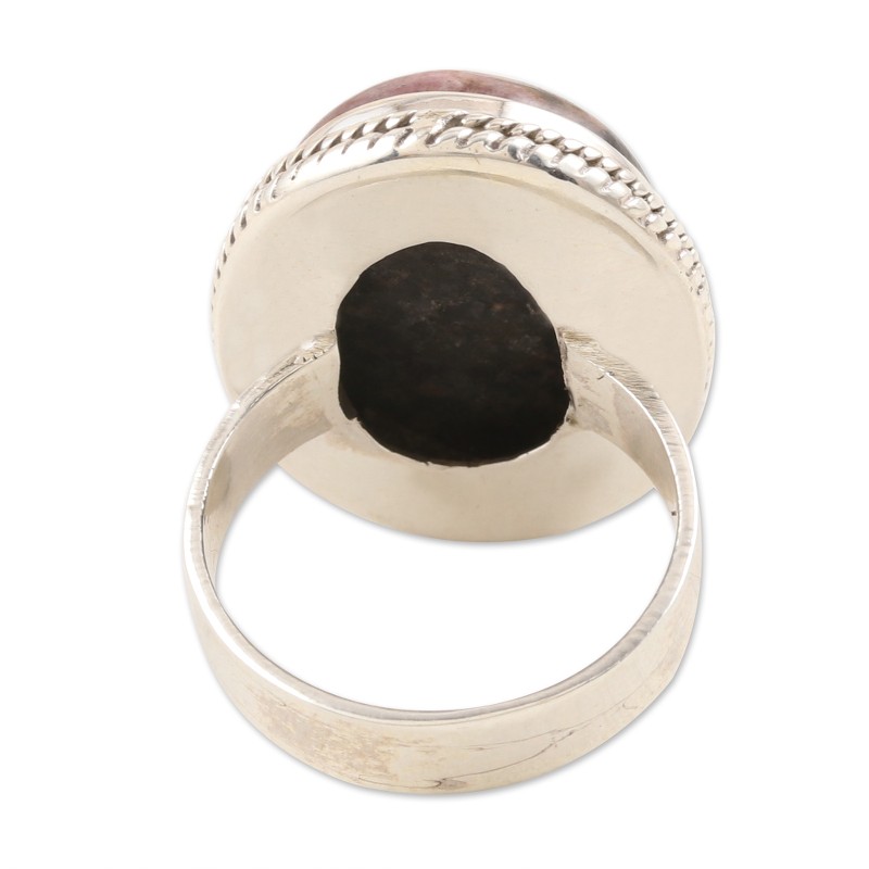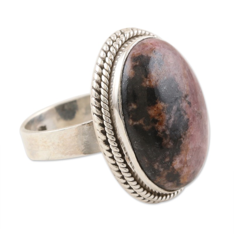 Balance your emotions and clear away negative thoughts with the healing properties of rhodonite. Indian artisan Rakesh Rana uses a smooth rhodonite gem in a bezel setting to craft the ring, circling the stone sterling silver roping in a combination finish.