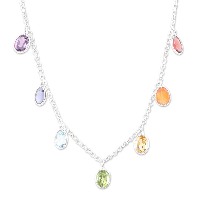 Let the colours of the rainbow fill your day with happiness by using this sterling silver charm necklace crafted in India. Presented by Alok Jain, the accessory has an oval-shaped jewel for each hue, including blue topaz, carnelian, garnet, citrine, peridot, amethyst and iolite gems.