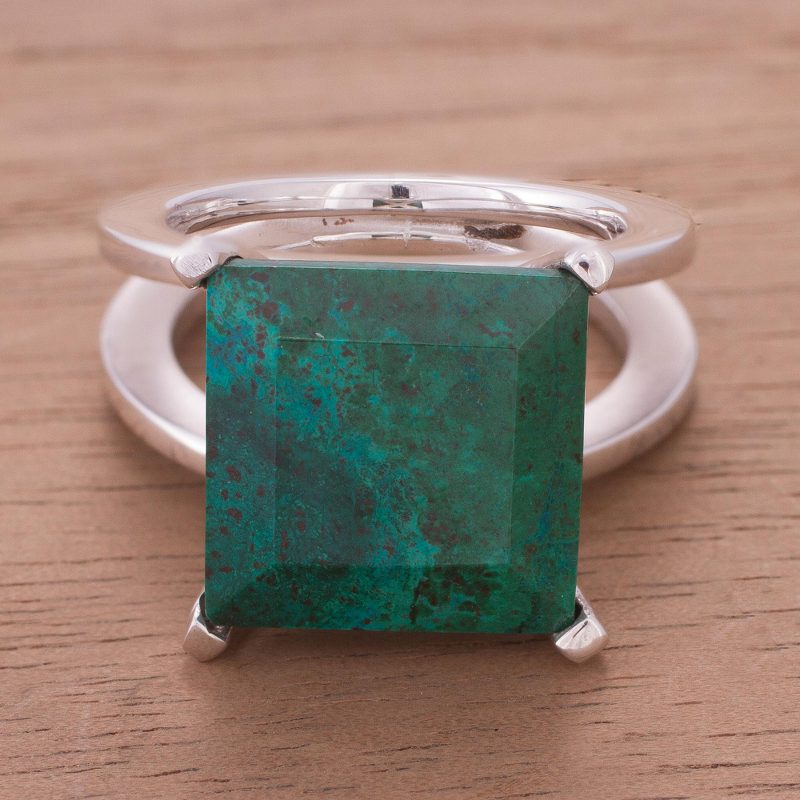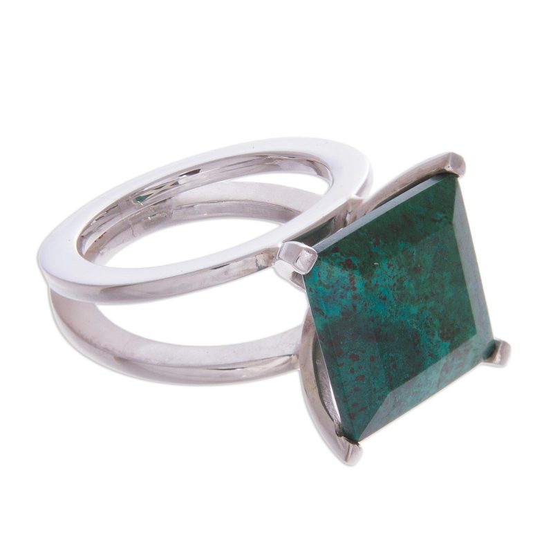 Evoking endless prairies, chrysocolla poses atop twin bands of silver. Carmen Anocibar designs a contemporary ring that combines precise geometry with the warmth of natural elements.