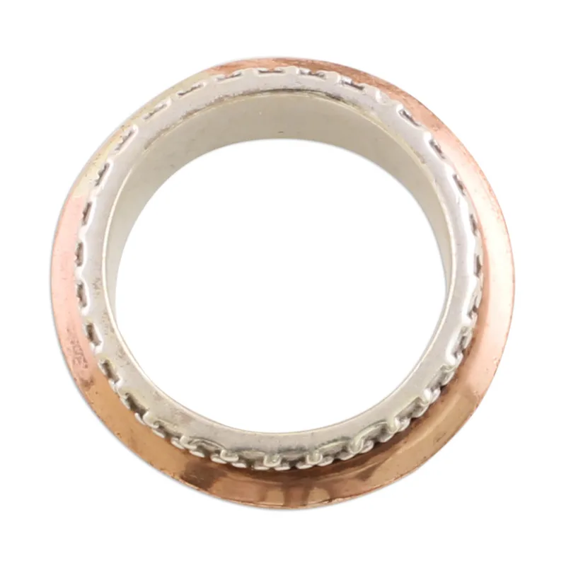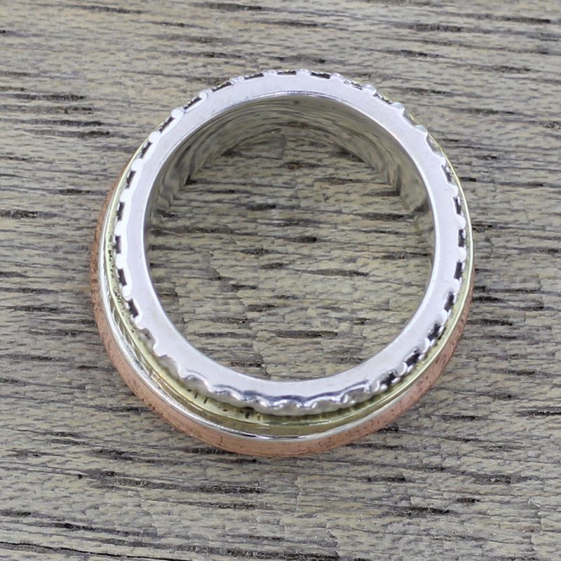 Meditation rings, or "spinner rings" are believed to reduce anxiety, purify negative thoughts, and induce a sense of peace and serenity. Crafted by hand by India's Neetu Barathi. Sterling silver, with spinning sections of textured brass, copper, and silver.