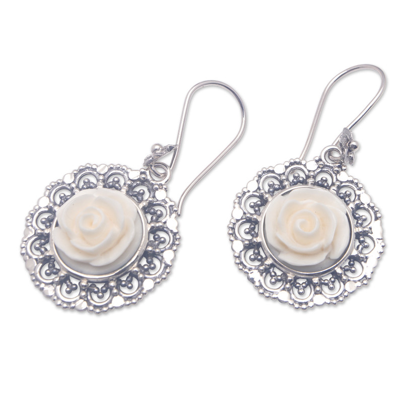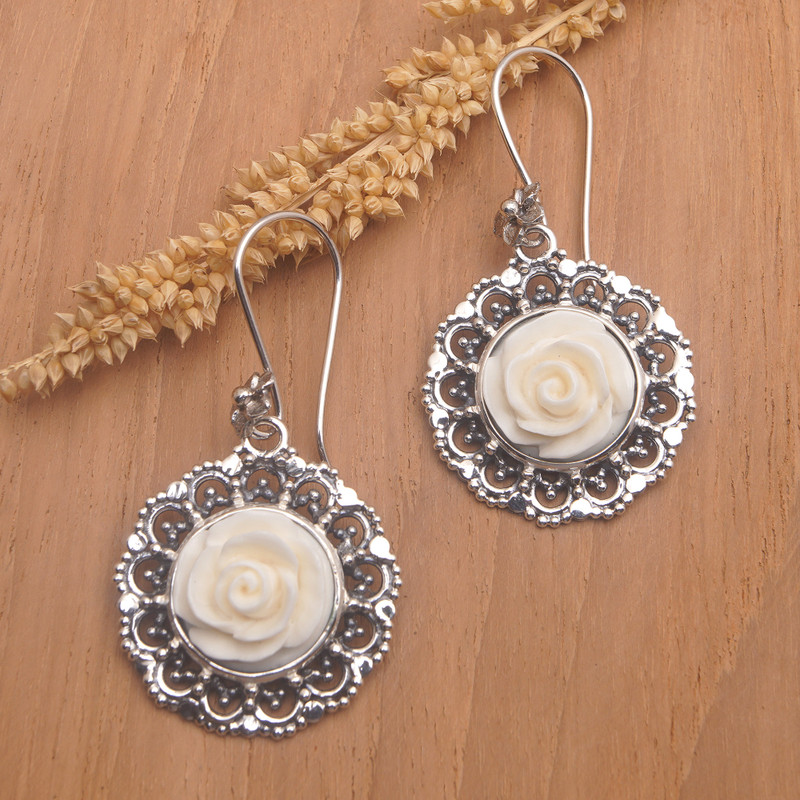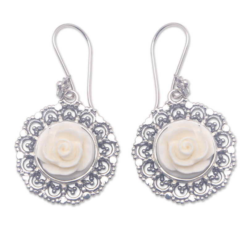 Backed by our 100% Happiness GuaranteeTamiangs are circular ornaments made from palm leaves that people in Indonesia hang from houses and buildings to protect them from danger. Bali's Buana sees them as a source of inspiration for a pair of ravishing dangle earrings featuring roses carved in bone and framed by exquisite openwork sterling silver accents.