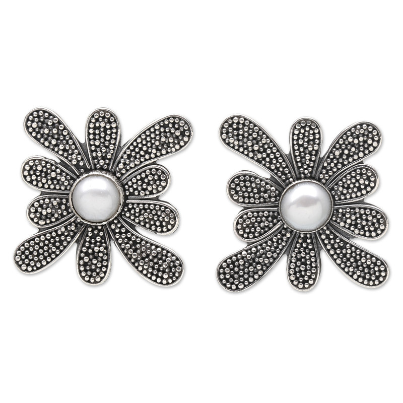 Fascinated by their luminous appearance, Bali's Arta Pradana adds cultured pearls to these sterling silver button earrings. Each with a floral design and a speckled pattern, the accessories have a charming aura thanks to the gems, symbolizing innocence and faith.
