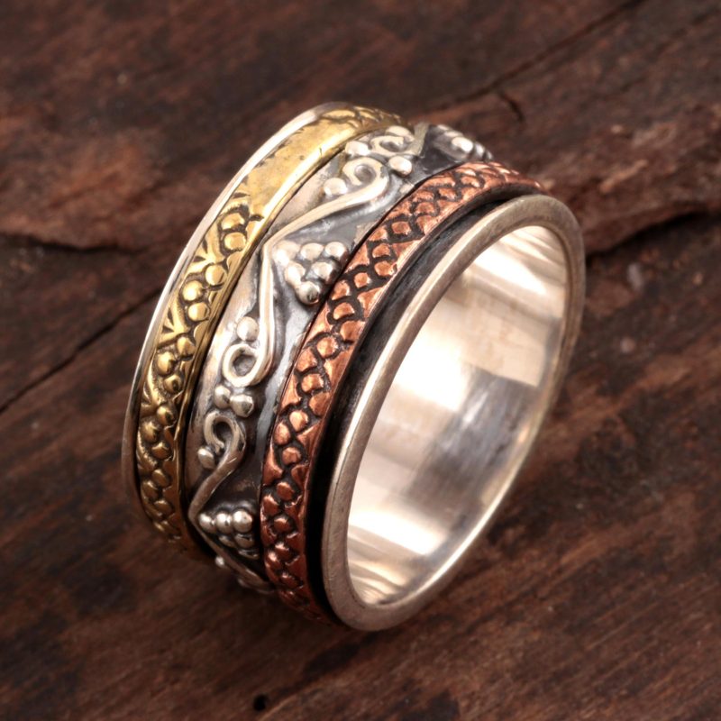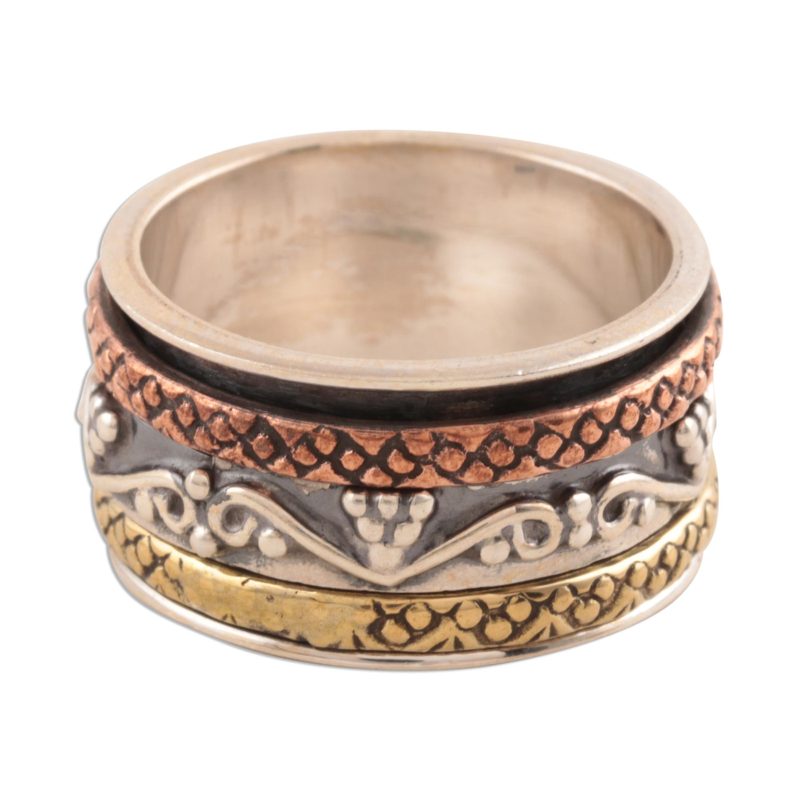 Backed by our 100% Happiness GuaranteeFlanked by patterned brass and copper bands, a single band of sterling silver spins around this Indian ring. Shivani Choudhary designs this ring, which circles the finger with a wide sterling band.
