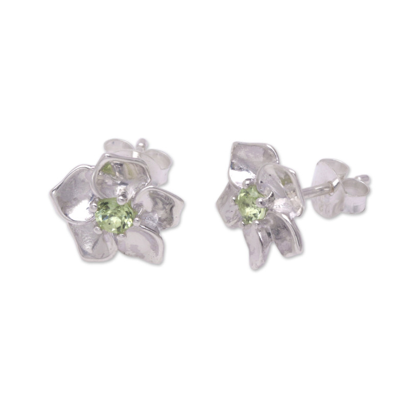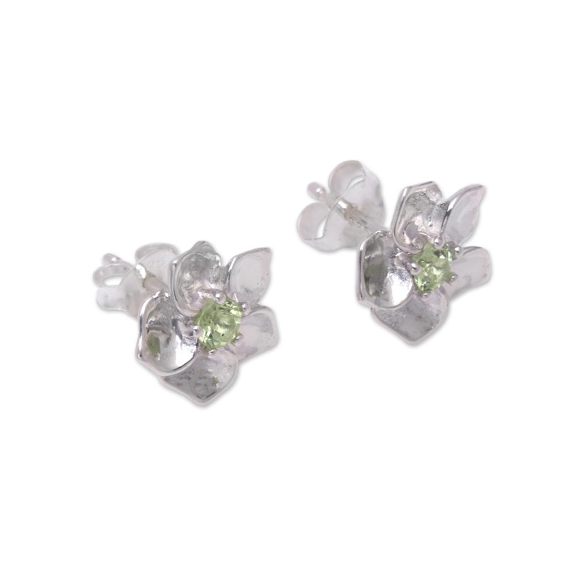 Many cultures associate peridot stones with prosperity and good fortune, as their green tone brings to mind Earth's abundance. Using these gems as the centrepiece, Balinese artisan Wayan Lasti crafts a pair of sterling silver stud earrings in a sweet flower shape. The accessory features a high polish finish for an elegant accent.