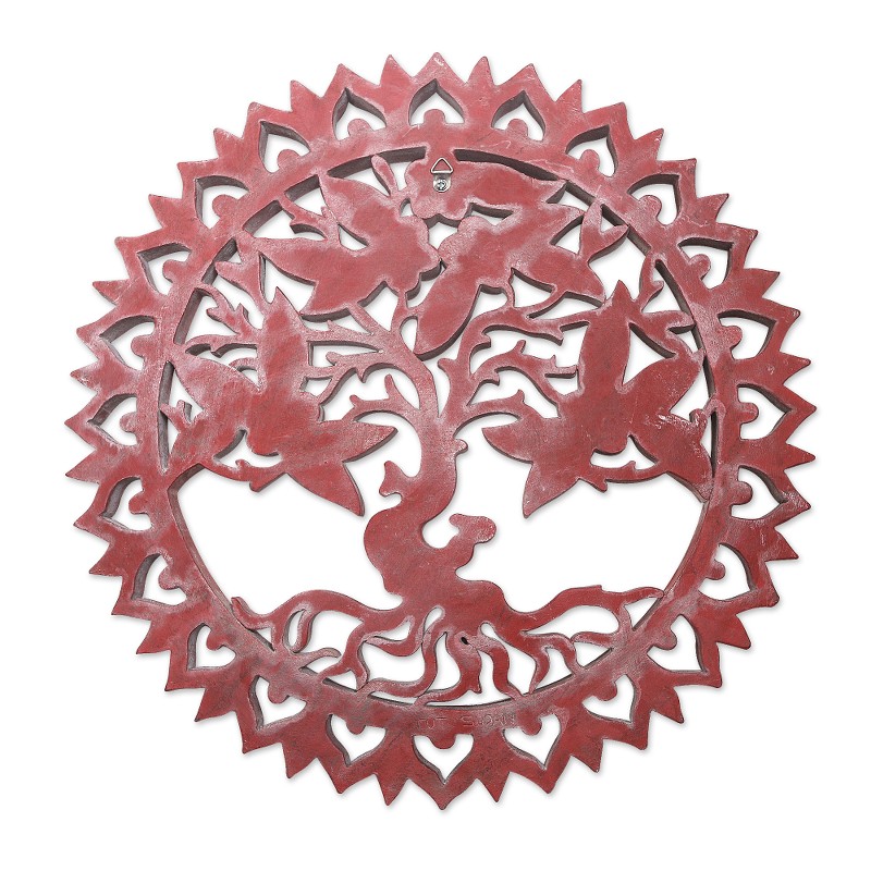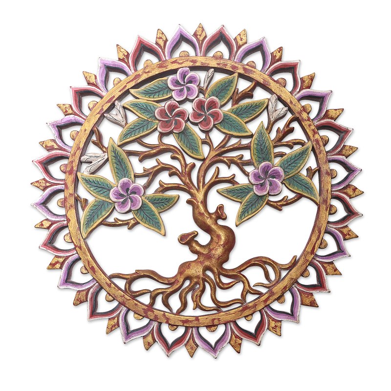 Bright red and purple flowers create a charming colour combination on Ketut Sudantara's relief panel. The Balinese artisan crafts the round panel from local suar wood, hand carving an openwork tree motif that shimmers with golden accents.