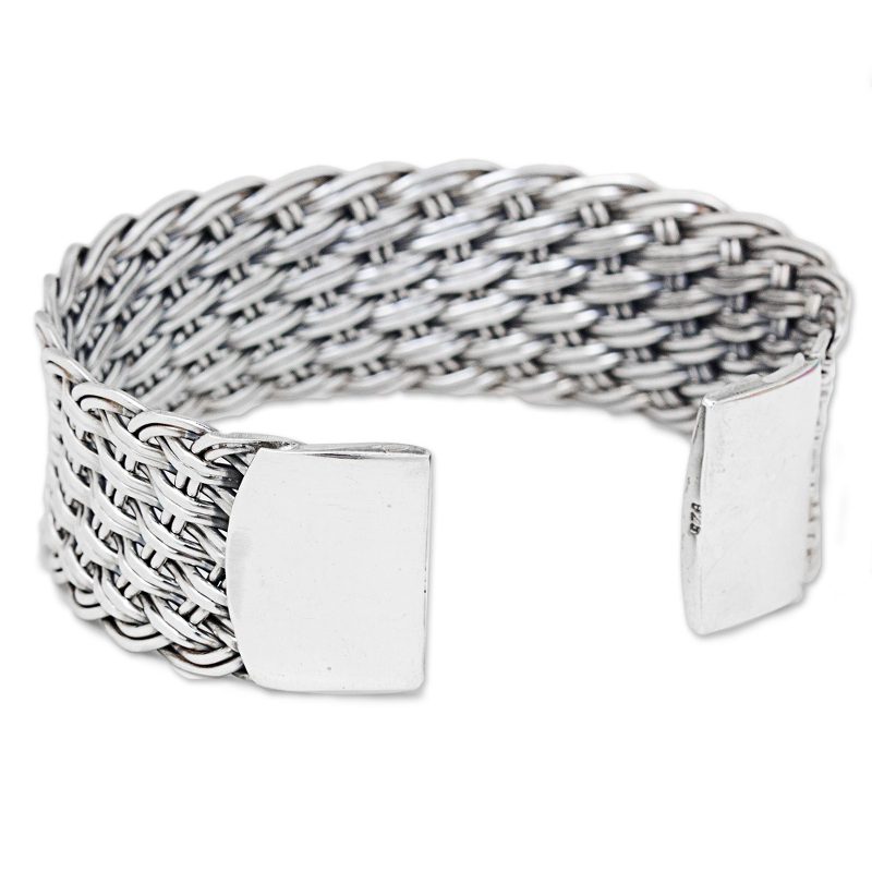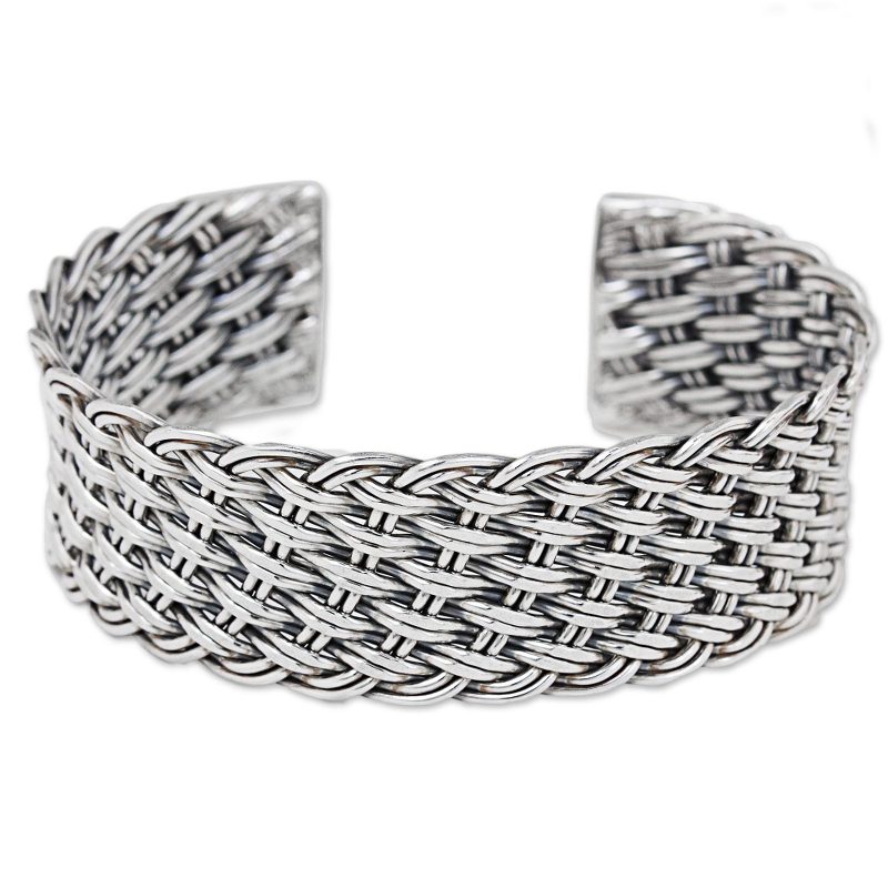 Woven by hand of sterling silver strands, this beautiful design recreates a traditional basketweave. Achara presents a cuff bracelet of rich textures, crafted by talented artisans of Thailand's Karen hill tribe.