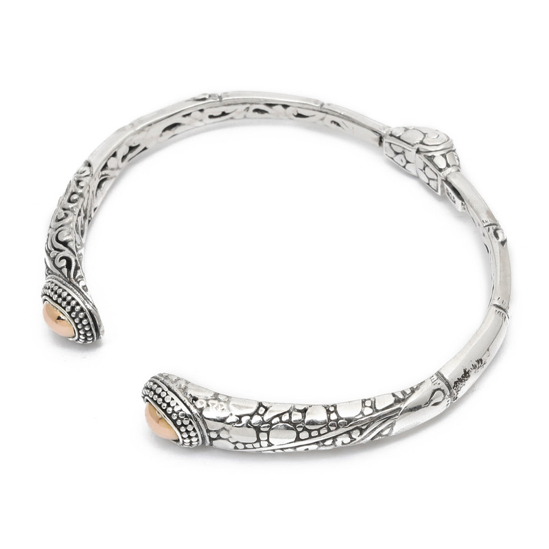 Imitating the thriving bamboo vines, gorgeous traditional motifs grow all around this sterling silver cuff bracelet's structure. Crafted in Bali by Komang Suastra, this exquisite accessory has a polished finish that enhances its classic aura, accented with 18k gold-plated details for a shiny look.