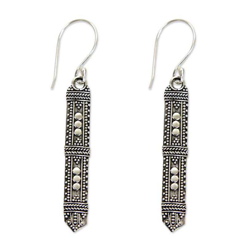You can find our sterling silver dangle earrings 'Borneo Scepter' by Komang Wijayana in jewellery categories such as No Stone Earrings, Silver Earrings, Sterling Silver Earrings, Dangle Earrings and Bar Earrings. Enjoy exploring these sections for other Novica treasures.