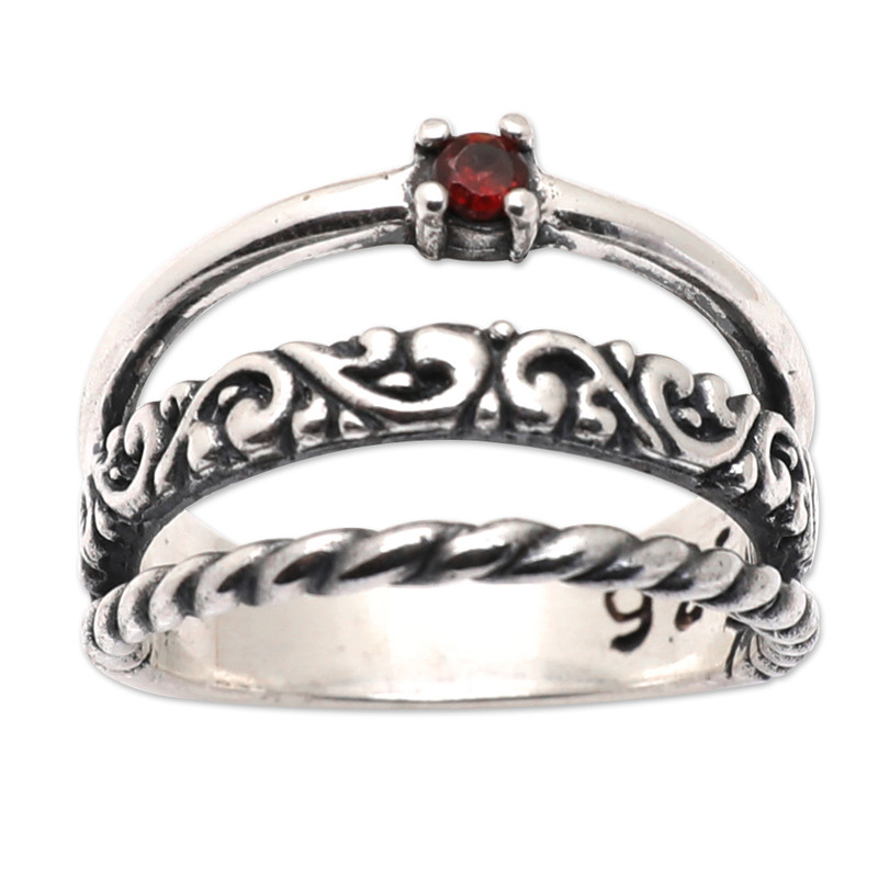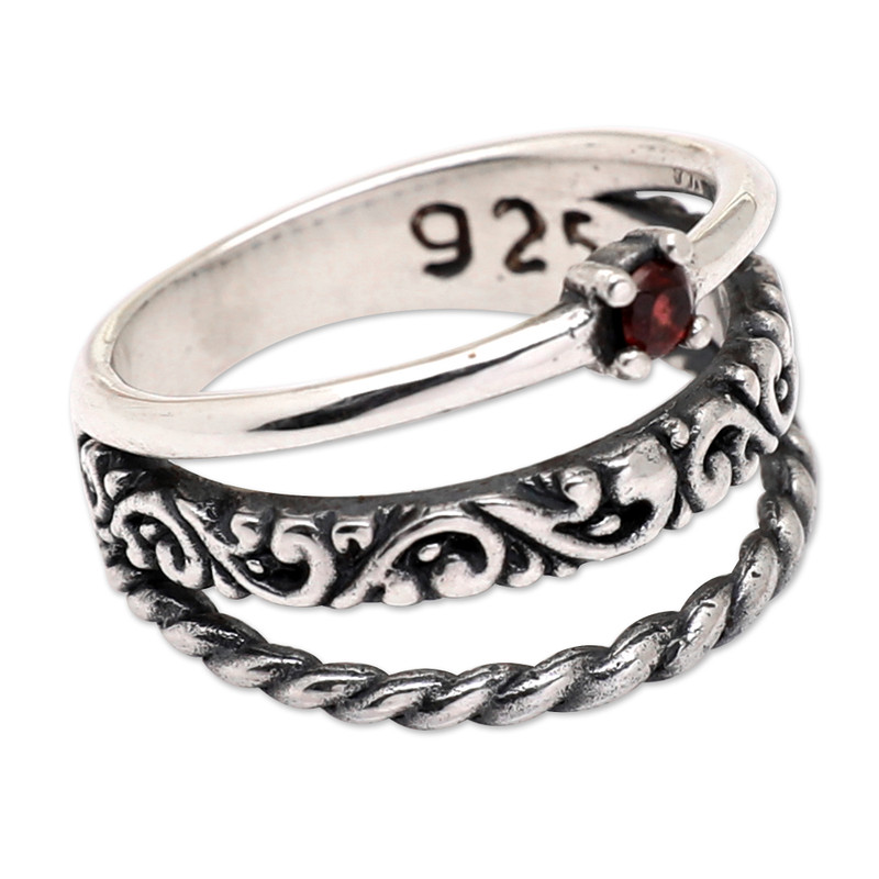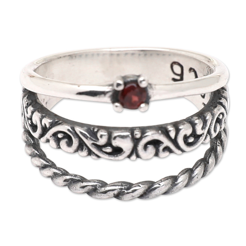Inspired by the captivating jungles of the paradisiacal Bali, artisan Wayan Lasti creates a magnificent accessory featuring traditional motifs, spiral accents, and precious elements. After crafting the structure from sterling silver, Wayan polishes this single stone ring for a glamorous look, crowning it with a luxurious garnet jewel symbolizing passion.
