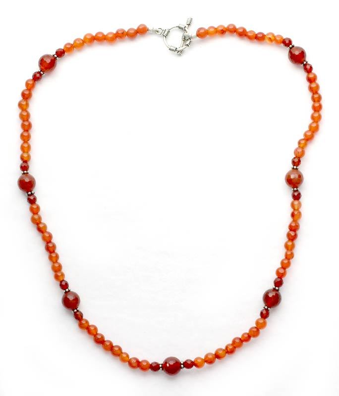 Narayannii designs a stylish necklace to showcase the warmth of natural carnelian, which represents July´s birthstone. Crafted by hand, it combines polished and faceted gemstone globes with ornate silver beads.