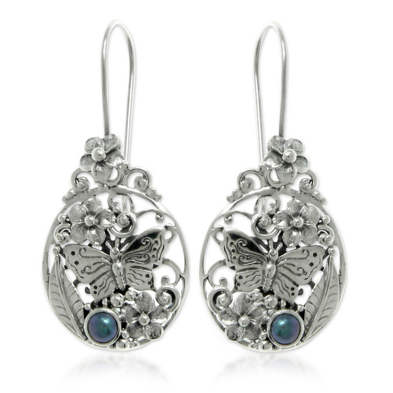 Backed by our 100% Happiness GuaranteeFlitting amid sterling frangipani blossoms, beautiful butterflies whisper of island summers. Buana crafts the images in silver and adds the allure of iridescent peacock pearls to these exquisite earrings.