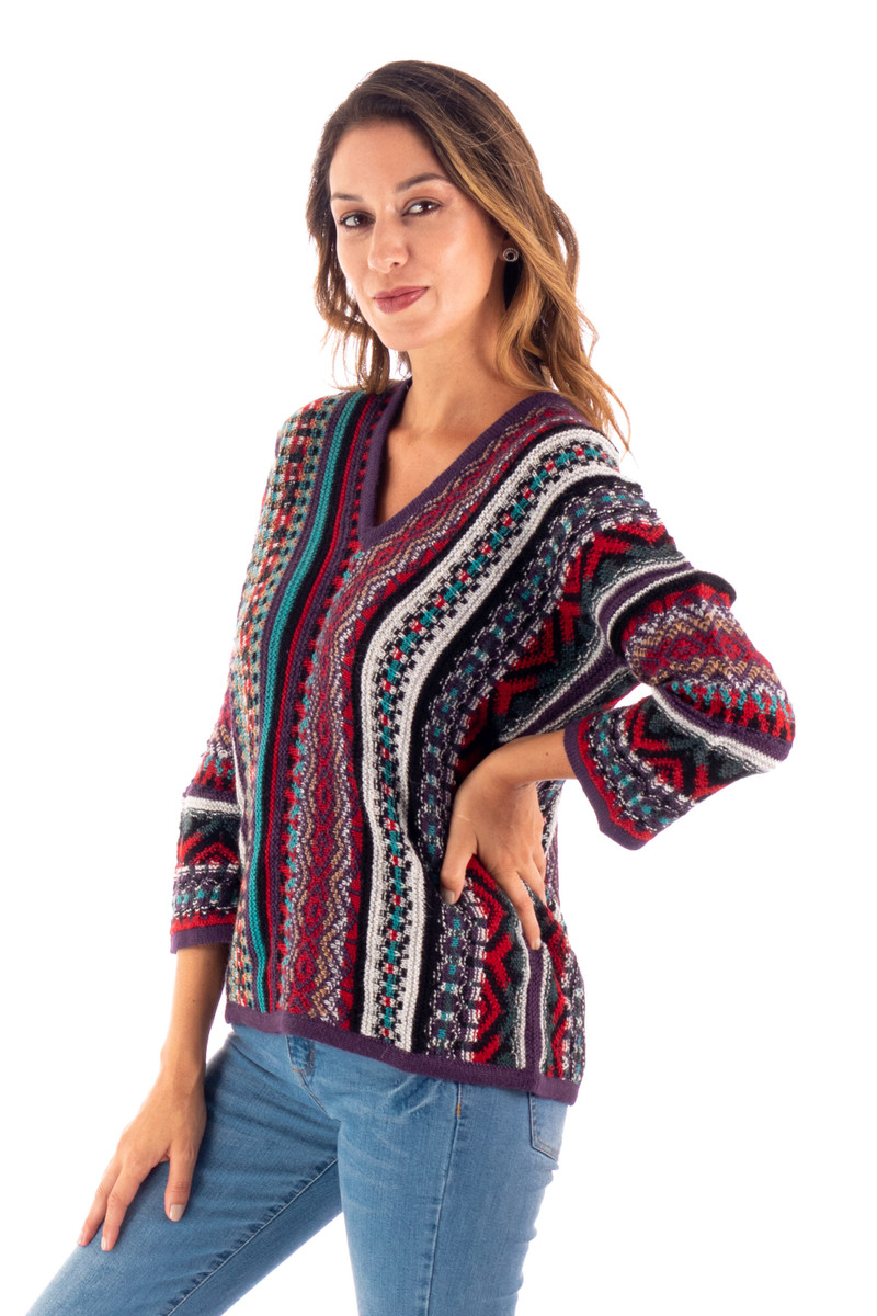 Backed by our 100% Happiness GuaranteeFeaturing kimono-style sleeves, this splendid V-neck sweater is a comfortable, soft and warm accessory for winter knitted from an alpaca, wool and acrylic blend. With colourful stripes and geometric patterns where black, oyster, ruby, purple, camel and cerulean stand out, the lovely sweater is designed by artisan Alfredo Falcon in Peru and will be a wonderful addition to your closet.