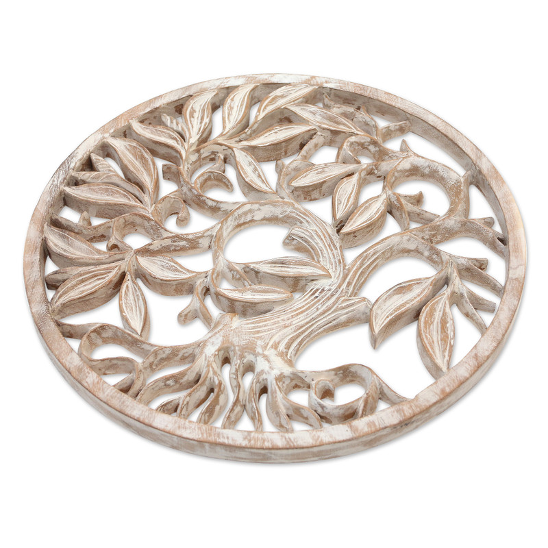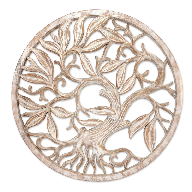 Backed by our 100% Happiness GuaranteeEvoking snow, a whitewashed finish decorates this suar wood relief panel from Bali. Made Mulyani creates this round relief, which is carefully carved by hand.