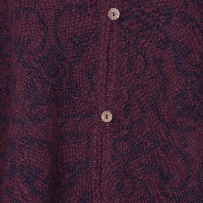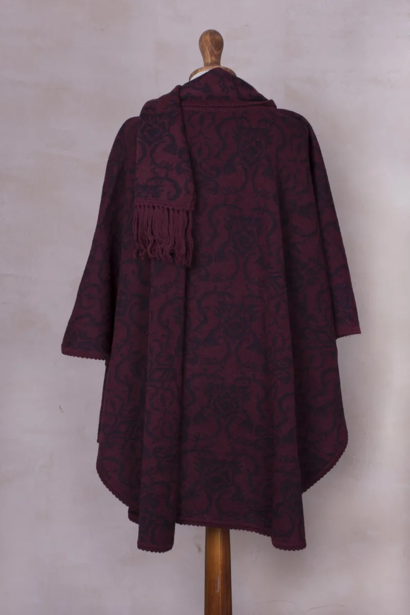 Versatile with lightweight warmth, this reversible alpaca-blend cloak is great for travel in changeable climates. Modeled after the Andean ruana, a traditional style of draped cloak, its pattern of flowers in boysenberry-purple and burgundy is inspired by the wildlife of the Peruvian mountainside. The generous attached scarf and button front keep you warm when winds pick up.