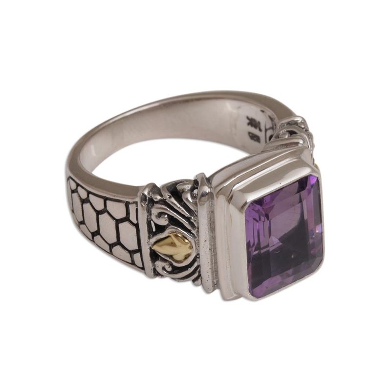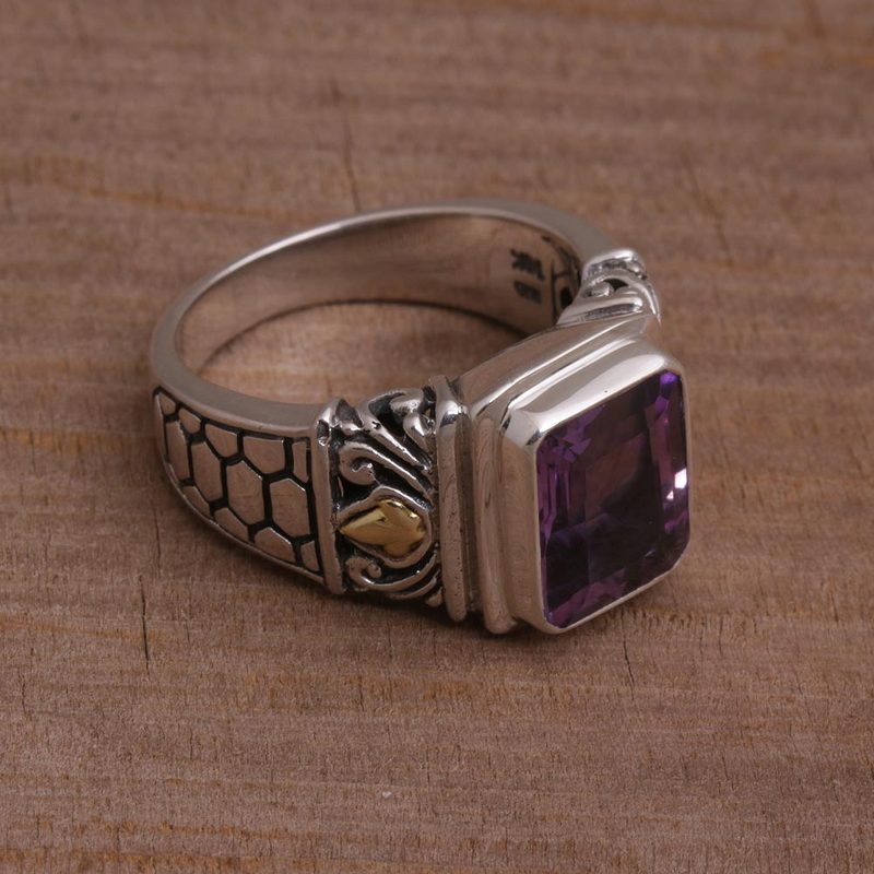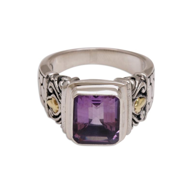 Backed by our 100% Happiness GuaranteeKadek Wijanegara handcrafts this bold, beautiful single-stone ring. Crowned with a dazzling amethyst, the engraved band is made from sterling silver with 18k gold accents. The rectangular amethyst weighs 2.5 carats.