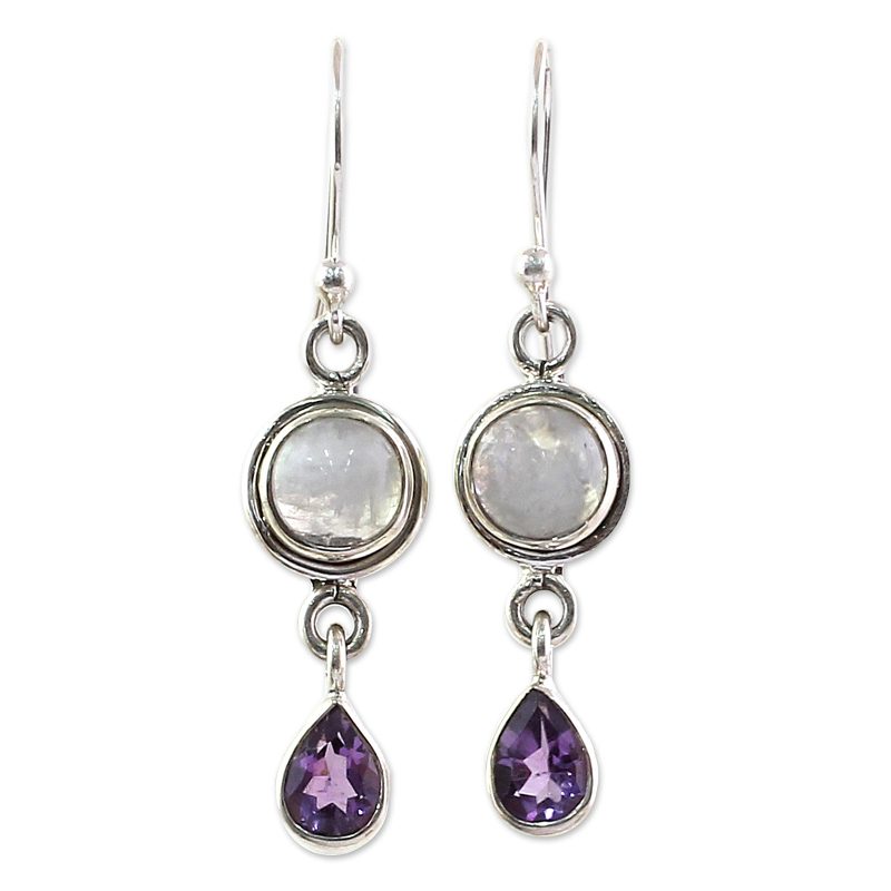 Backed by our 100% Happiness GuaranteeOver one carat of teardrop-shaped amethyst stones hang below round rainbow moonstone in this pair of dangle earrings designed by India's Neeru Goel. Handcrafted sterling silver bezels surround the stones for a truly beautiful look.