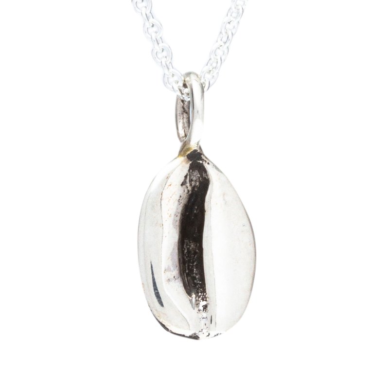 centreed on a sterling rolo chain, a realistic coffee bean dangles. Guillermo Arregui in Mexico crafts the pendant from gleaming Taxco sterling silver.