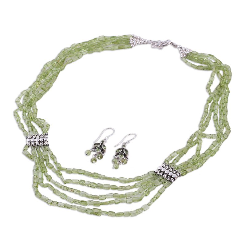 For Indian designer Shanker, gemstones represent a declaration of love. Five sparkling strands of peridot form the lavish necklace while sterling bars hold them in place. Drop earrings in silver settings complete the beautiful jewelry set.