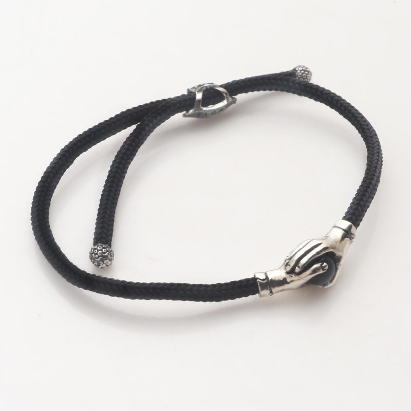 A truly lovely bracelet, arrived without delay though backordered and inside a pretty bag in which to keep it. The design is simple and also wonderfully executed--the hands securely clasp each other and also the obsidian orb, and the bracelet is easy wear. So glad that I purchased this elegant piece of jewelry!