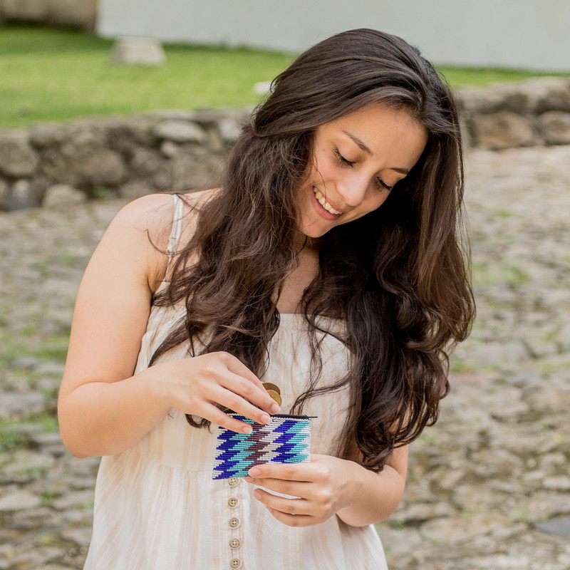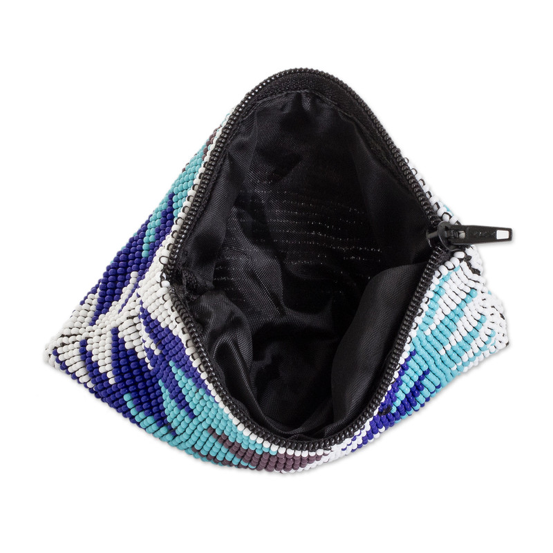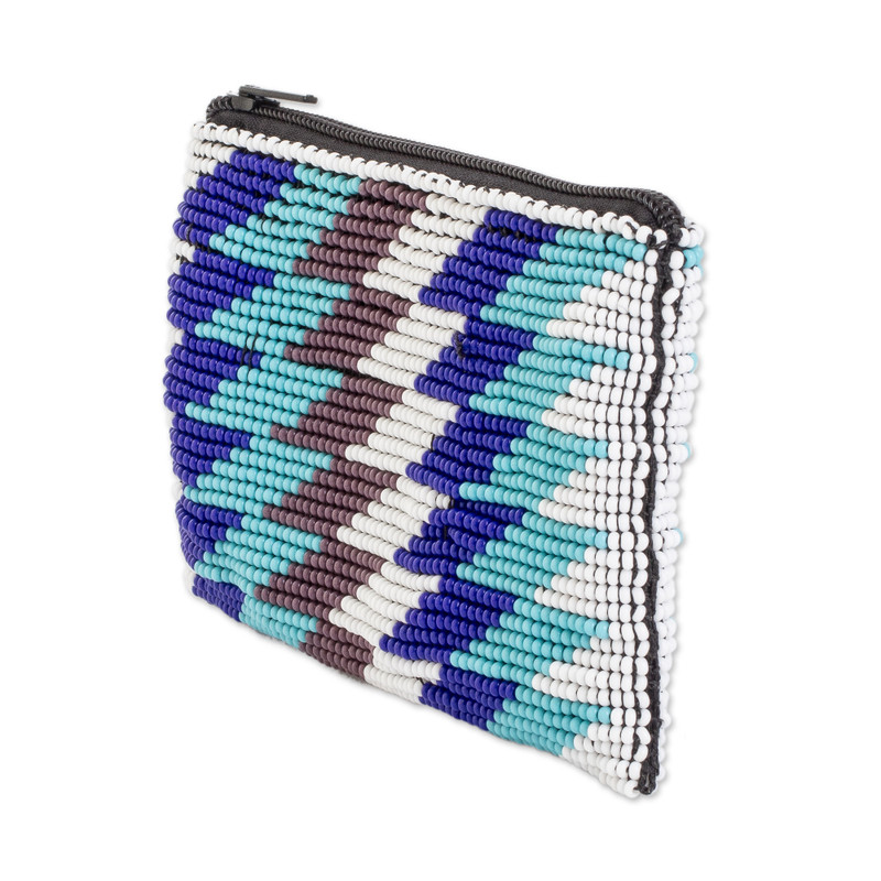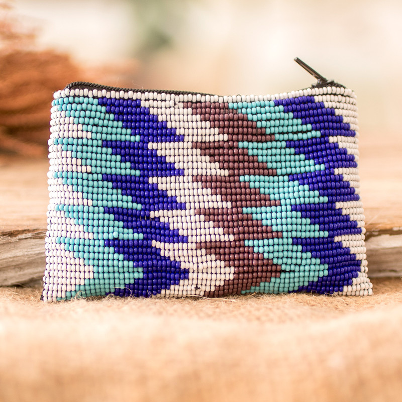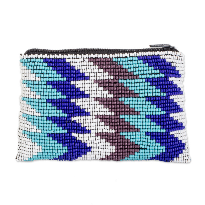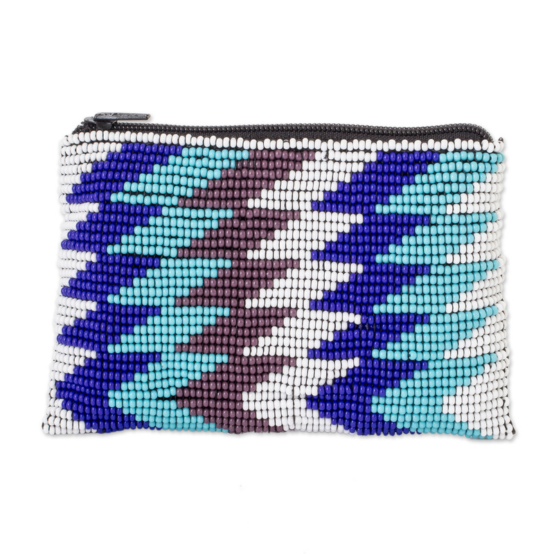 Delivery EstimateHandcrafted with meticulous care by the talented artisans of the Santiago Atitlan Women's Group in Guatemala, this exquisite coin purse is a testament to their skill and artistry. Delicately adorned with petite glass beads in shades of blue, light blue, white and purple, it showcases a captivating zigzag pattern that catches the eye. Secured with a convenient zipper closure, this purse is a stylish and practical storage solution for bills, change, credit cards and other essentials.
