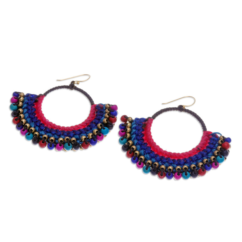 Awake to the light and style of a captivating creation made to enhance your oneiric spirit. Thailand's Tiraphan Hasub works with traditional macrame techniques and waxed polyester cords to create these dangle earrings, equipped with gold-plated hooks and vibrant magnesite beads as a symbol of creativity. The handwoven pieces—crowned with brass accents—also feature a palette of fuchsia and blue hues, evoking the colours of a serene dream.
