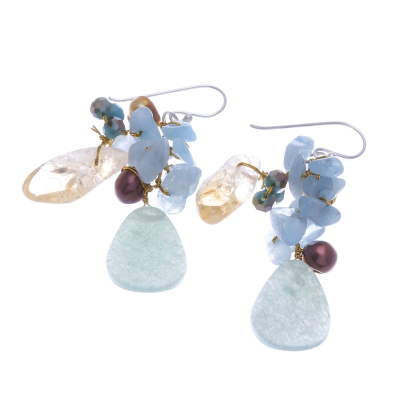 Crafted from majestic jewels in a palette of blue hues, these cluster dangle earrings are a dazzling fashion statement characterised by their intricate design, typical of Thai artisan Nareerat's sublime creations. The designer uses a combination of aquamarine, cultured pearls, aventurine, citrine and glass beads to produce the piece's stunning vibe, all joined with silk threads. With the gems arranged meticulously around this wondrous accessory, the final touch is in the sterling hooks, allowing an easy fit.