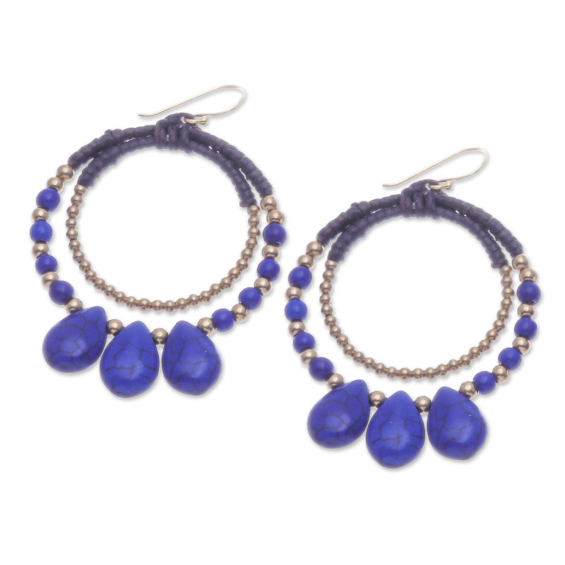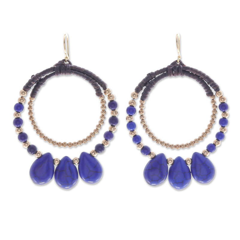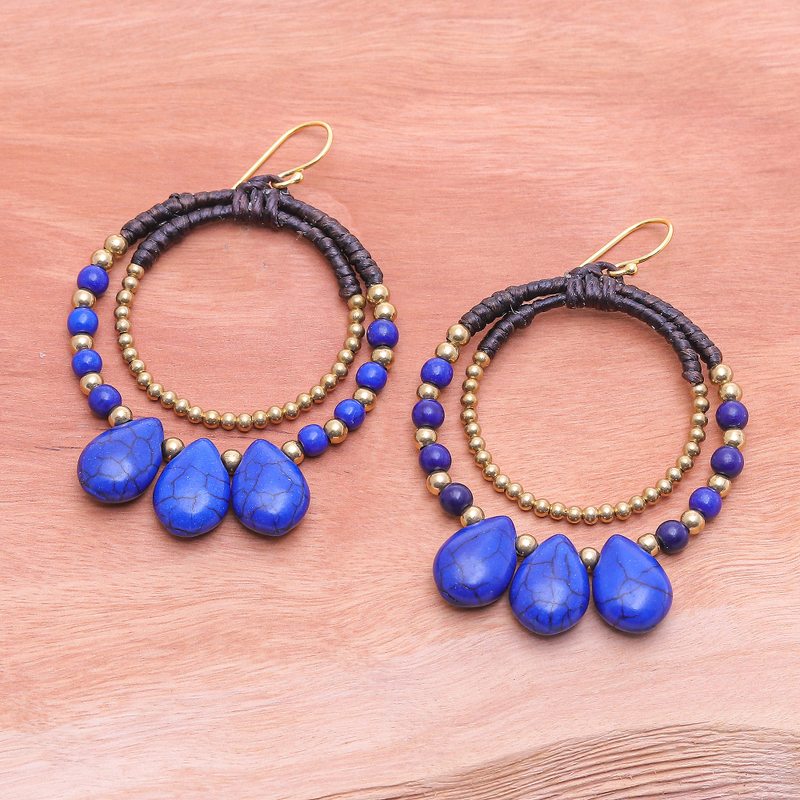Reuniting elegance, mysticism and tradition, Thai artisan Tiraphan Hasub creates a superb accessory, adding magic to your days. These dangle earrings feature round structures accented with shiny brass beads and dark blue magnesite jewels, whose enchanting aura carries a message of creativity. With all pieces joined by waxed polyester cords, the accessories also have gold-plated hooks for easy wear.