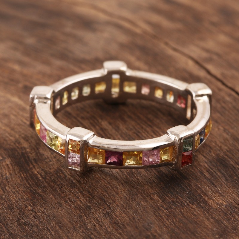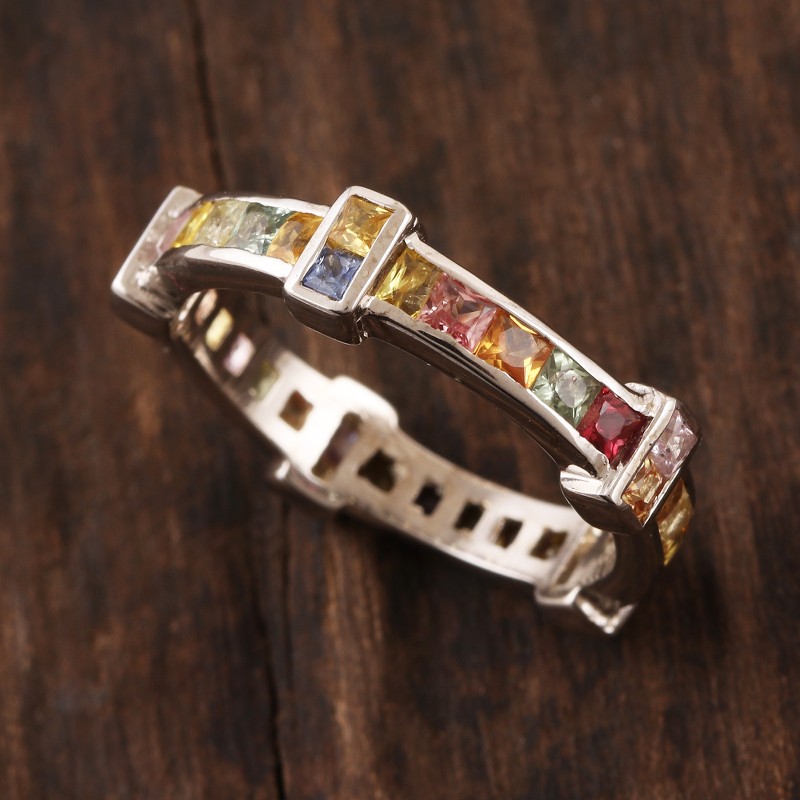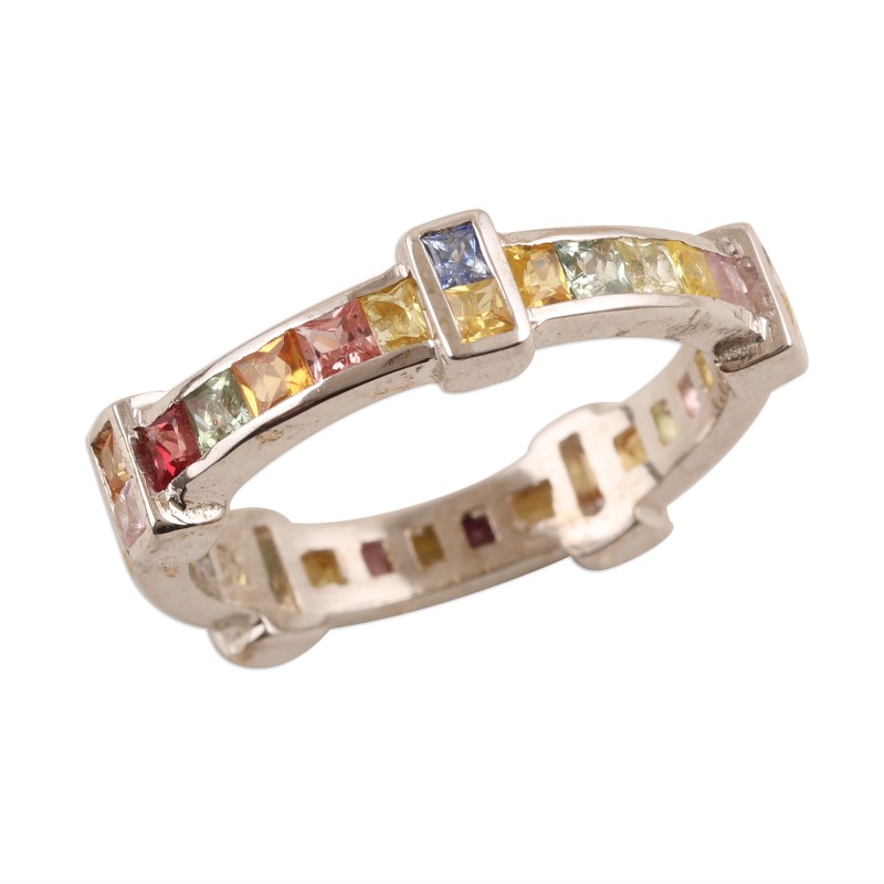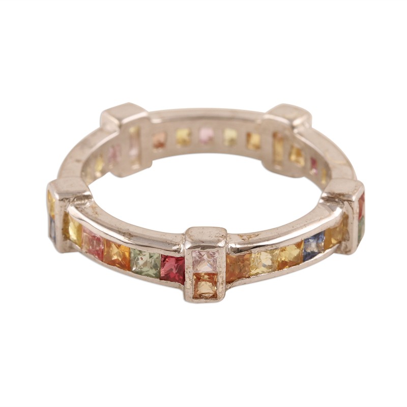 This breathtaking band ring from Bhavesh in India is set with one full carat of sapphires in a rainbow of colors. The channel-set gemstones cats a colorful glow from their brilliant rhodium plated sterling silver settings.