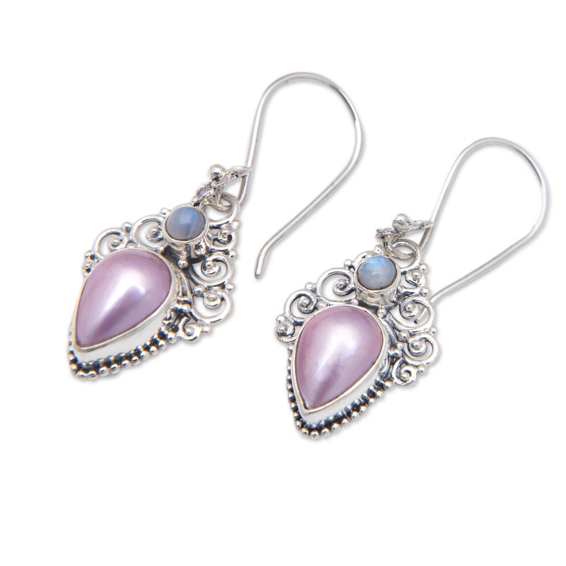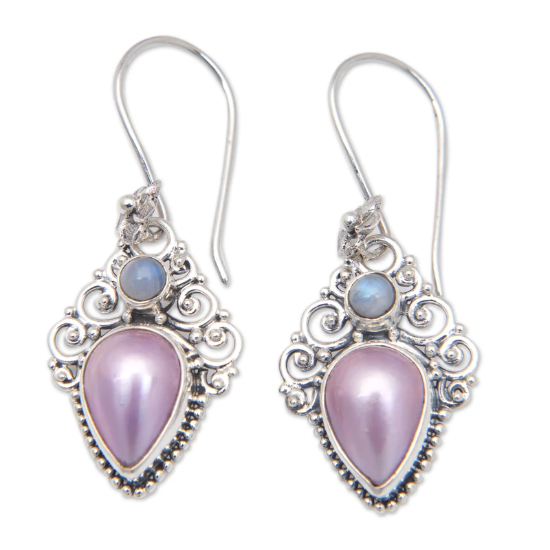 Imitating the classic details adorning those sumptuous palaces of the baroque era, Bali's Buana creates these sterling silver dangle earrings using advanced techniques, allowing the design to have that unique divine aura. The polished structure features leafy details, all meticulously crafted to enrich the beauty of the rainbow moonstones at the top and the pink cultured pearls at the bottom, symbols of harmony and kindness.