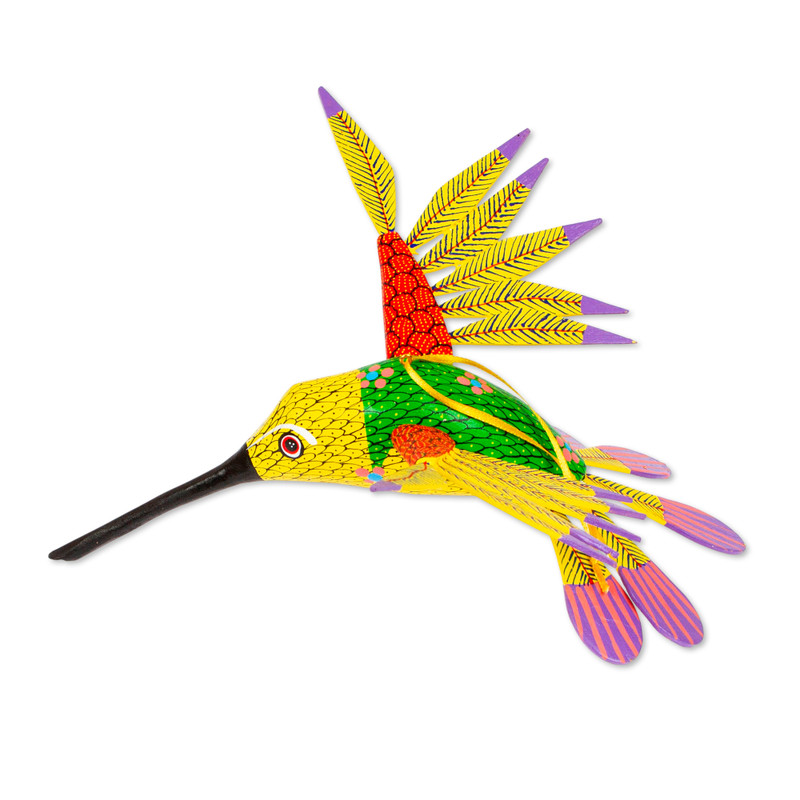 Jesus and Roxana Hernandez handcraft this lovely Mexican alebrije of copal wood. Each alebrije is unique, with the artisans using the natural shape of the copal wood to help determine the final form of the carving. With yellow and red plumage tipped in purple, it will delight you with all the hand-painted details. The bird has an unobtrusive hook on its back for easy hanging, and small parts are separated for shipping to protect from breakage.