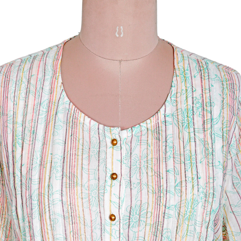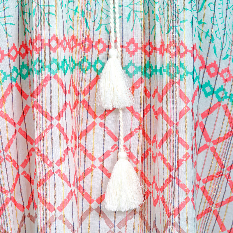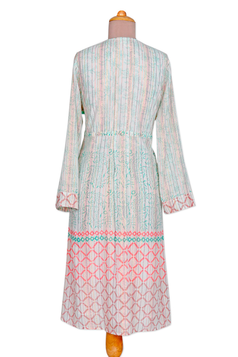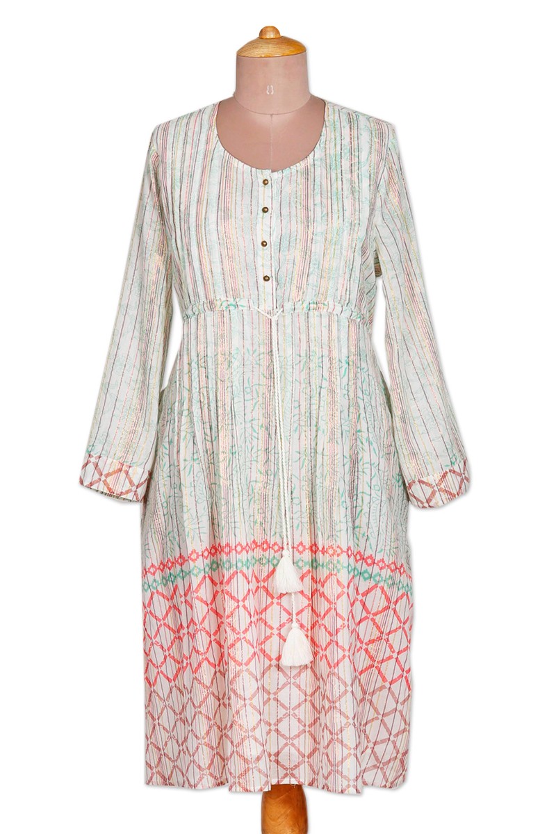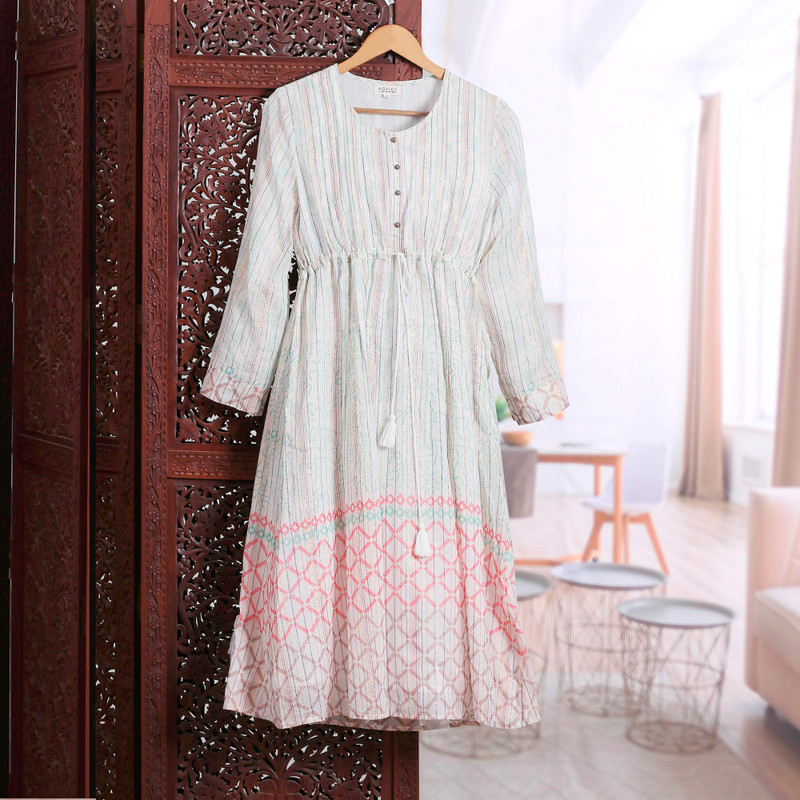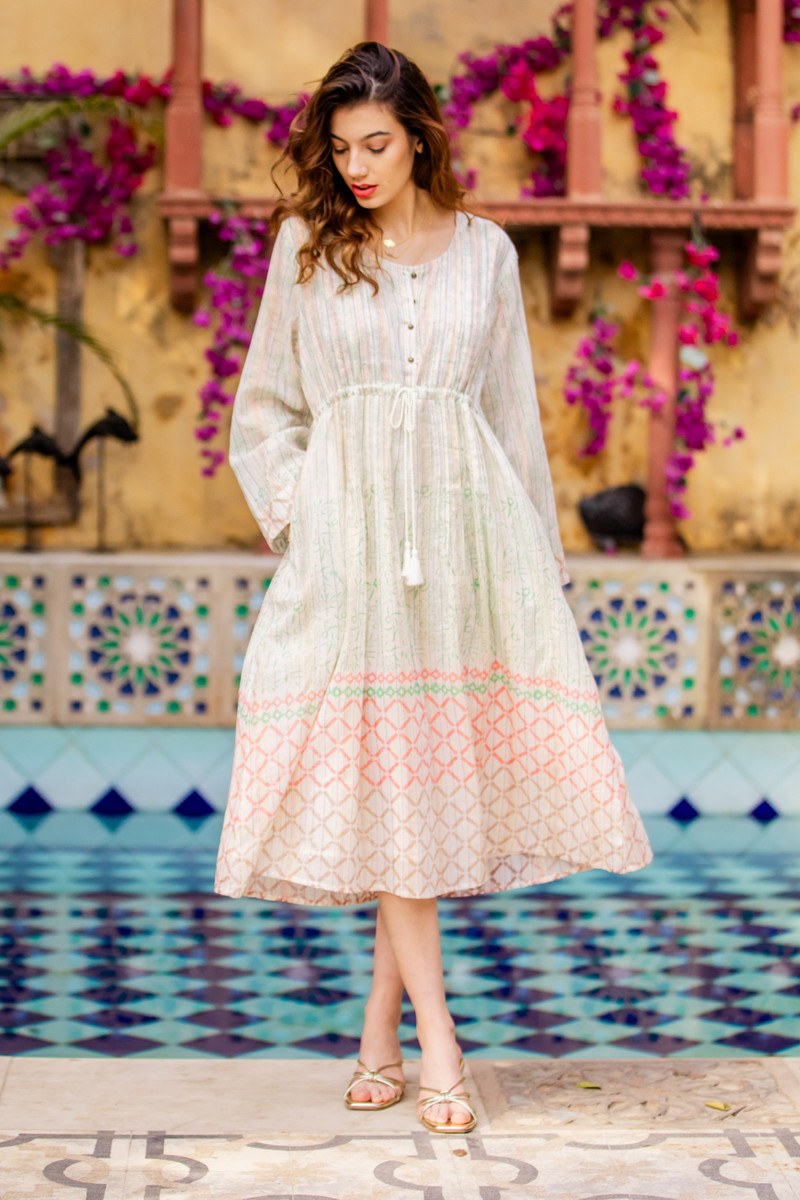 colourful stripes as well as floral, leaf and geometric patterns in sunrise, jade and graphite hues over an ivory backdrop grace this stylish empire waist midi dress by India's Anchal Ahuja. Crafted from a blend of cotton and shimmering Lurex, this fashionable dress boasts pintuck accents, long sleeves, a round neckline, metallic buttons and a lovely drawstring closure with delicate tassels.