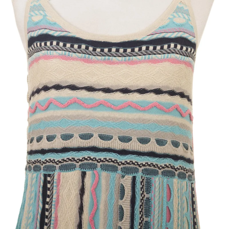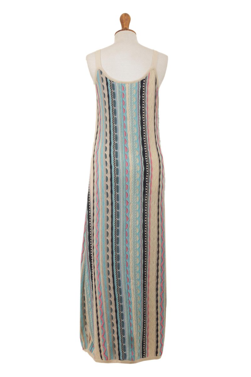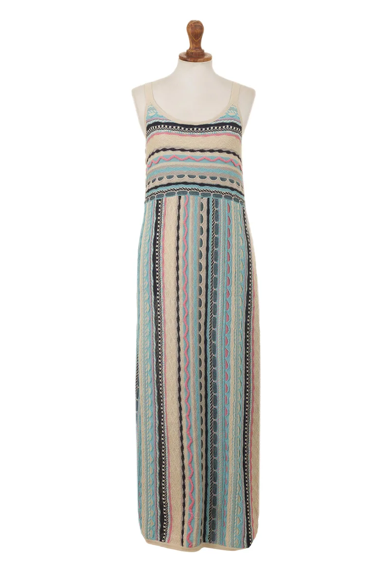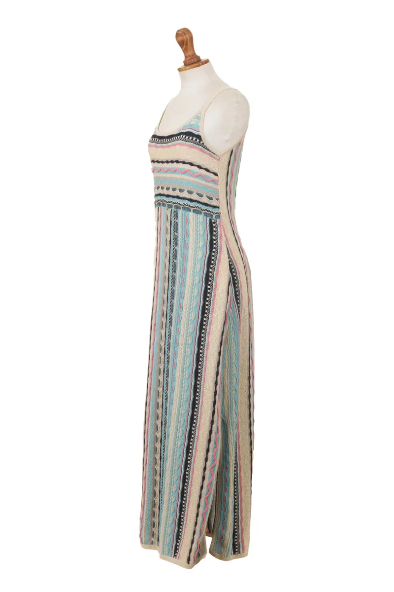 Backed by our 100% Happiness GuaranteeThis beautifully feminine maxi dress from Peru's Cristina Villalobos hugs your body in all the right places. The dress is knit from soft cotton yarns in sky blue, ivory, pink, pale grey and navy. A mix of knit patterns adds visual and textural interest to the dress, which features slender shoulder straps and side slits.