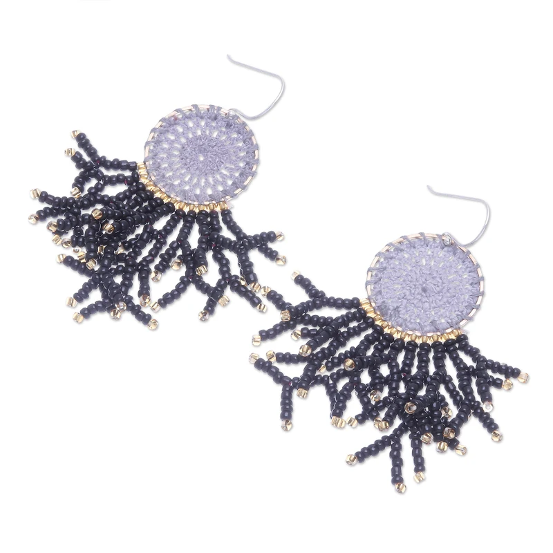 Backed by our 100% Happiness GuaranteeArtisans in the Thailand studio of Nareerat craft these eye-catching dangle earrings in black and grey with golden accents. Hung from sterling silver ear hooks, brass rings are crocheted with grey cotton thread to form a dreamcatcher, with strings of jet-black glass beads in varying lengths hanging below.