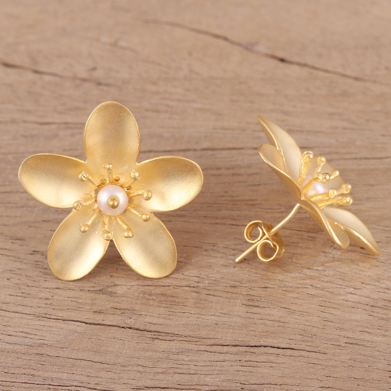 Backed by our 100% Happiness GuaranteeIndia's Vivek Nathany designs charming button earrings from 22k gold plated sterling silver and accentuates them with petite cultured pearls. Crafted in the shape of a flower that is ripe for pollination, this is one jewelry piece that is ready to bloom year round with rounded petals and protruding stamen holding the pearl nectar within.