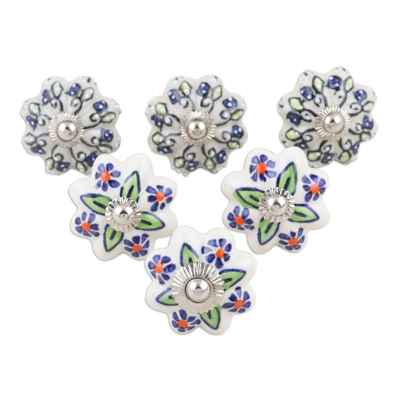 Backed by our 100% Happiness GuaranteeHand-painted with dazzling floral motifs, Chirag Choudhary's set of decorative knobs are a great way to beautify your kitchen. Indian artisans craft the set from ceramic, outfitting each knob with nickel-plated iron fixtures before glazing the ceramic for polish and durability.