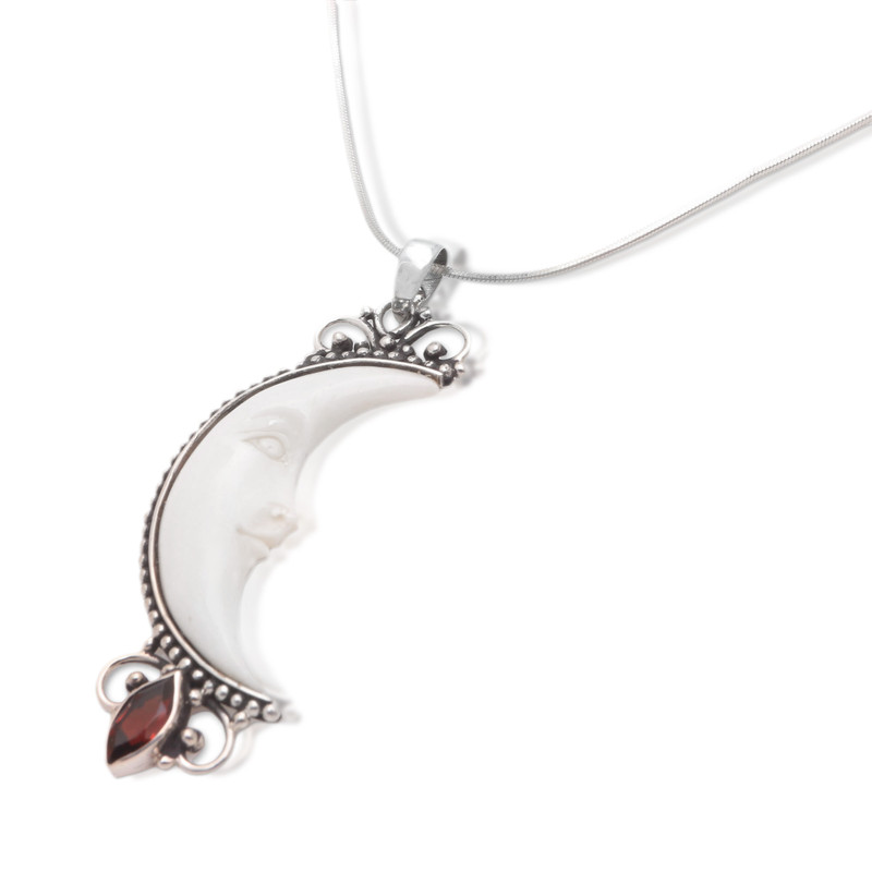 Backed by our 100% Happiness GuaranteeBalinese artisan Made Wardika diligently hand-crafts crescent moons from bone and sterling silver. The faceted marquise garnet represents the approaching sunrise.