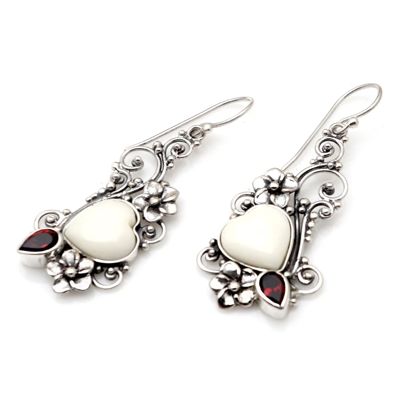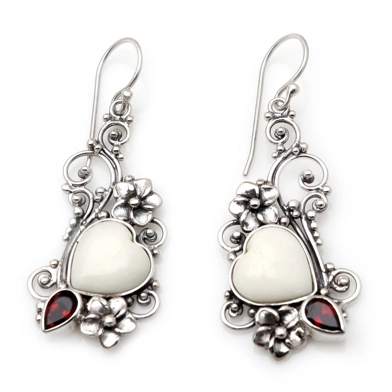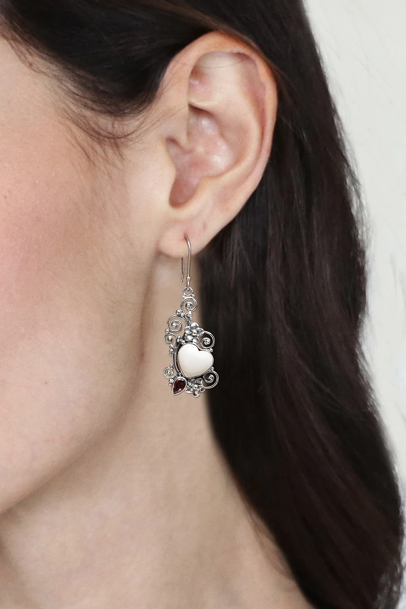 Let yourself fall in love with Made Wardika's lovely heart-themed earrings. The Balinese artisan hand carves the heart from bone in a sterling silver setting, while faceted garnet gems and sterling silver accents gently cradle the heart in gleaming flowers.