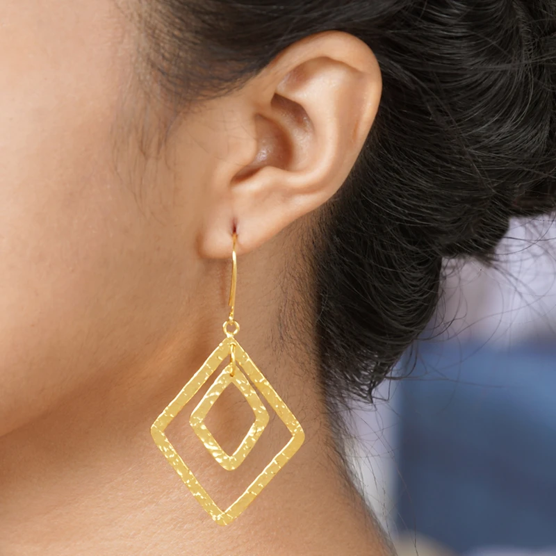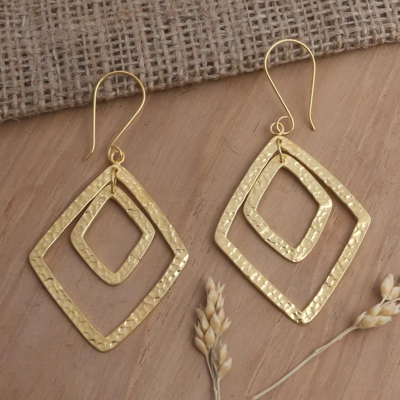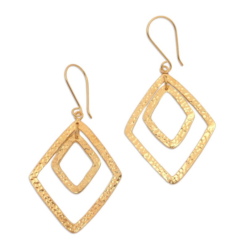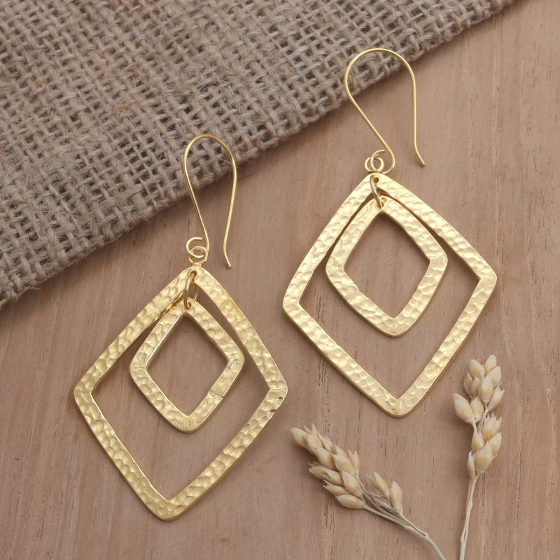 Perfect for party-wear, Wayan Karang's dangle earrings are designed to be worn with your favorite going-out dress. Balinese artisans hand craft the earrings from 22k gold-plated brass, layering one diamond motif inside another for a lovely layered effect.