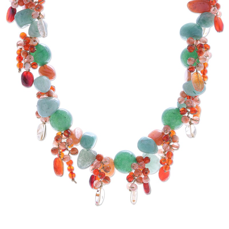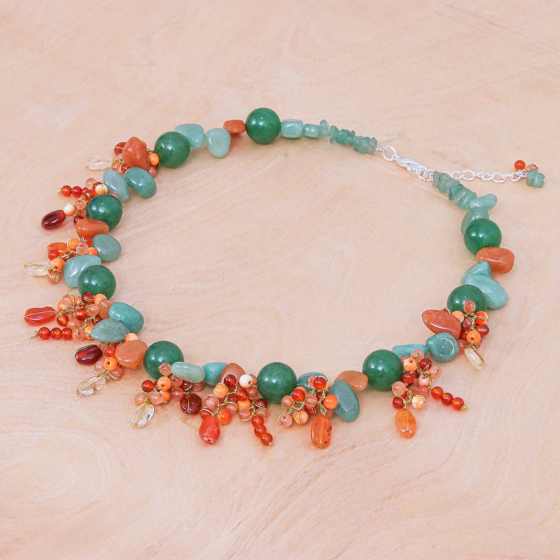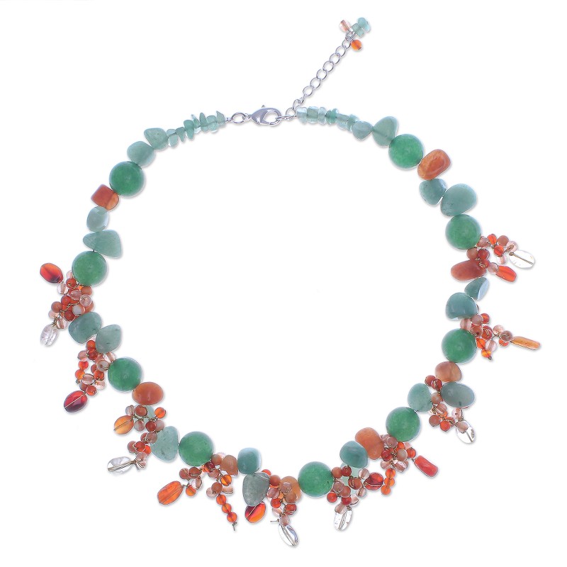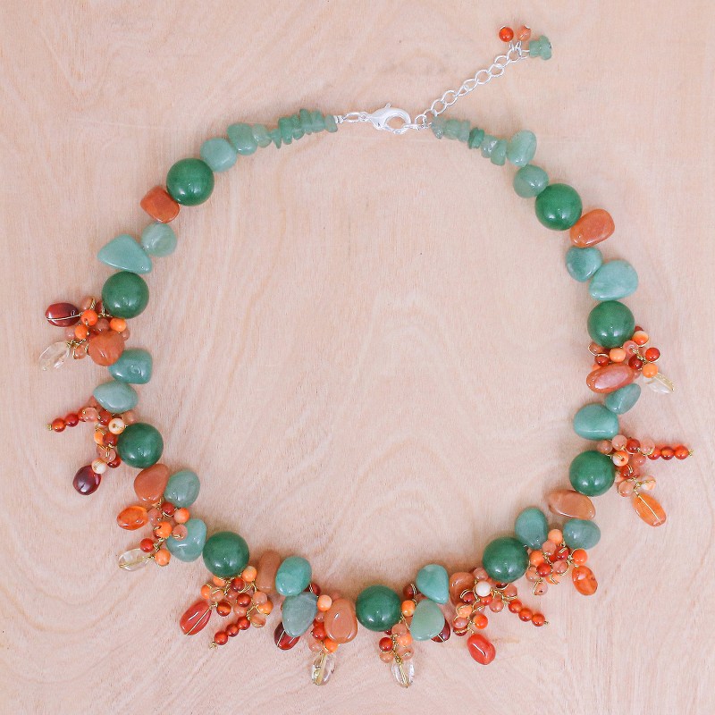 Backed by our Happiness GuaranteePair Nereerat's attention-grabbing beaded necklace with an understated ensemble. To craft the necklace, the Thai artisan hand knots shimmering silk thread around green quartz chips, orange carnelian and chalcedony beads, and freeform aventurine. A silver-plated brass lobster claw clasp and extender chain finishes the necklace with a bit of shine.