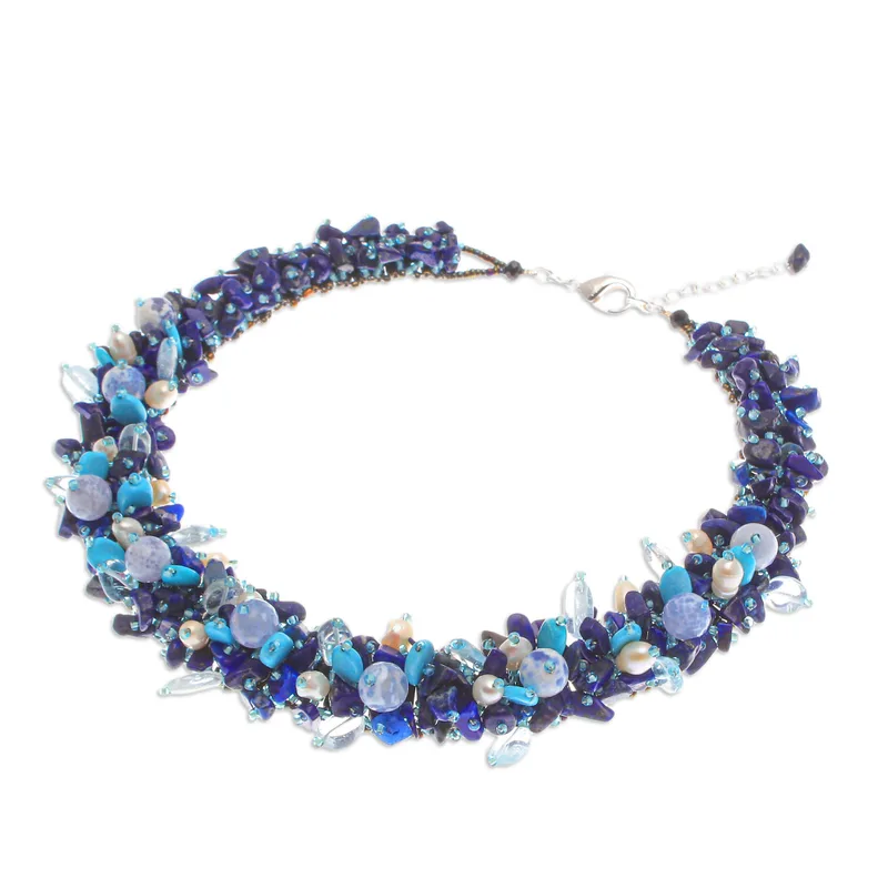 Thai artisan Nareerat handcrafts this accessory from multiple gems, all following a tender palette that makes a pretty accent for any outfit. With agate and quartz beads, lapis lazuli chips and cultured pearls embellishing the necklace, the final touch is in the silver-plated brass clasp and extender. On top of that, the blue colour scheme adds a special meaning to the item, as it symbolizes imagination and loyalty.