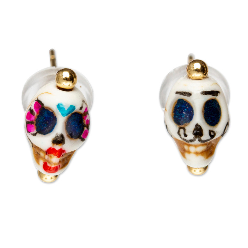 The essence of the Day of the Dead inspires Josefina and Cecilia to create a gorgeous accessory full of magic and joy. The Mexican team starts the design by working on howlite stones and painting a loving couple of skulls by hand, using a palette of blue and fuchsia hues. These stud earrings also come with 14k gold-plated steel accents that add a majestic look to the pieces, ready to shine with you on that special celebration.