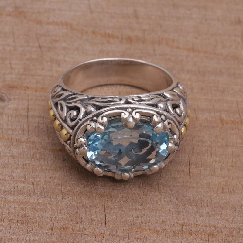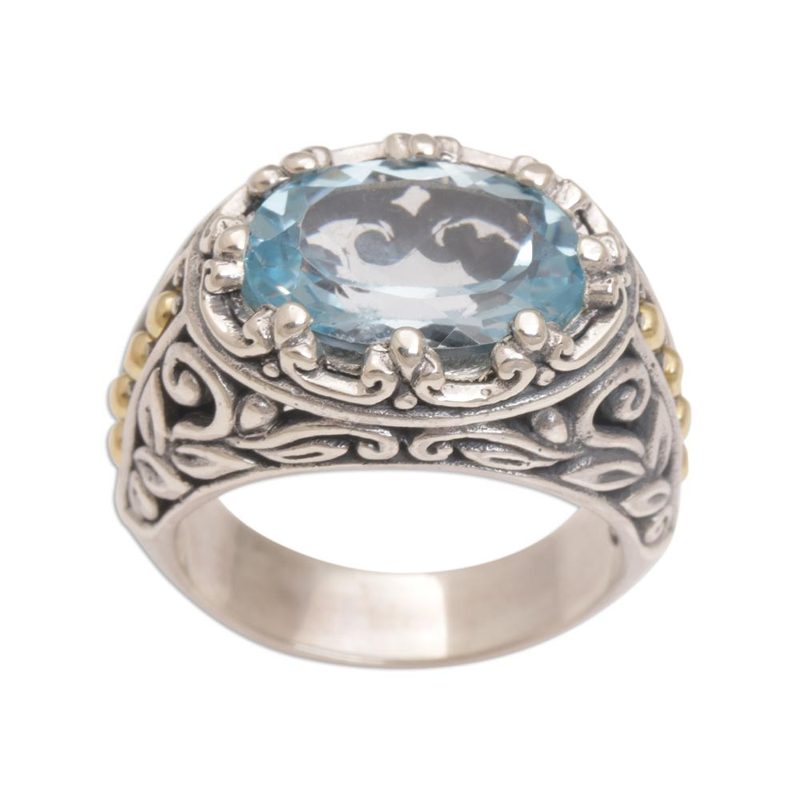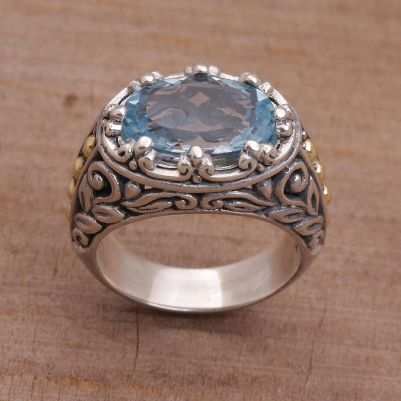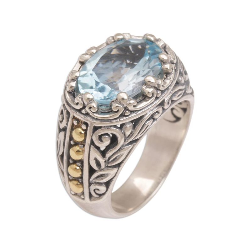 Backed by our 100% Happiness GuaranteeThe radiant hue of blue topaz dazzles the eye in this ornate cocktail ring. Handmade by Indonesian artisan Kadek Wijanegara, the ring bears a gem weighing over ten carats. Sterling silver leaf motifs and gold plated dot accents adorn the ring's wide band.