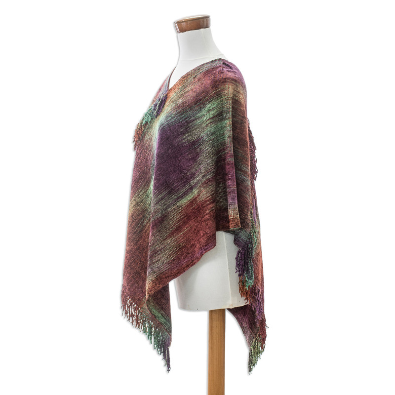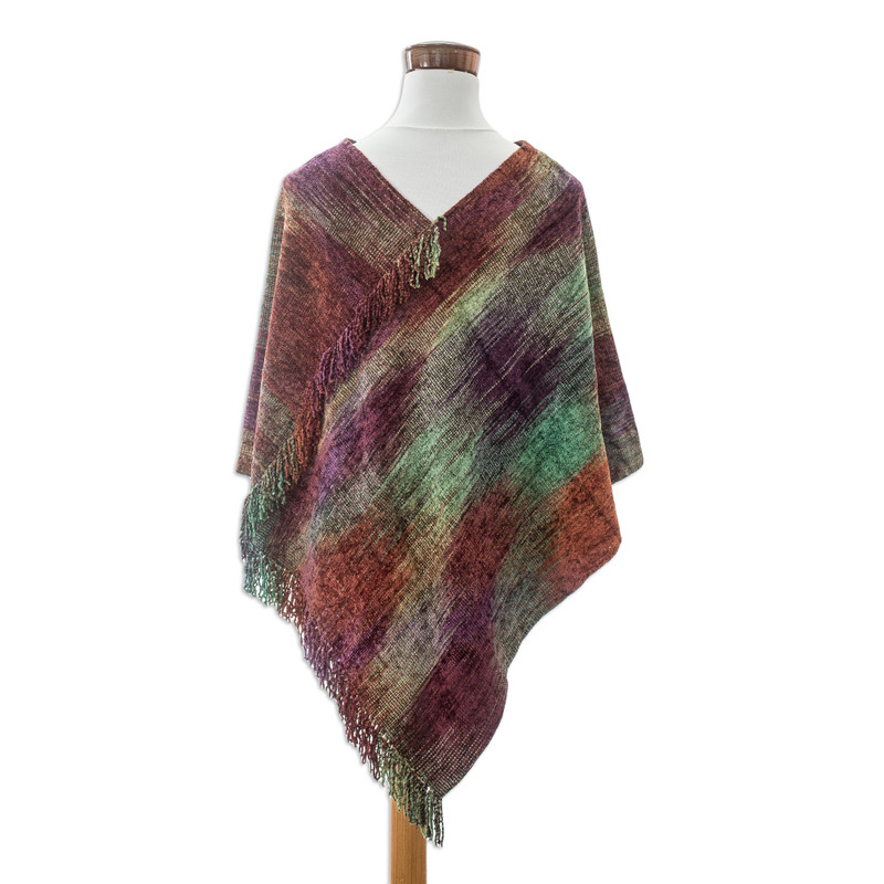 Backed by our 100% Happiness GuaranteeArtisans of the K'amolon K'i K'ojonel Association from Guatemala revolutionize the traditional poncho with a modern pattern that allows for a glamorous aura. Working with cotton and rayon made from bamboo, they weave the garment in a colorful palette that enhances the purple accents of the design, with little fringes at the front, back and bottom.